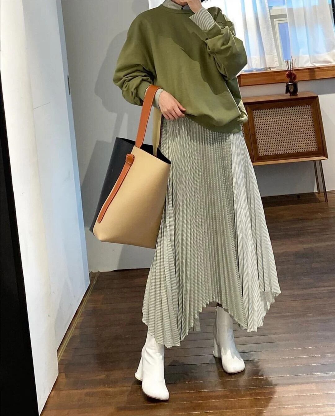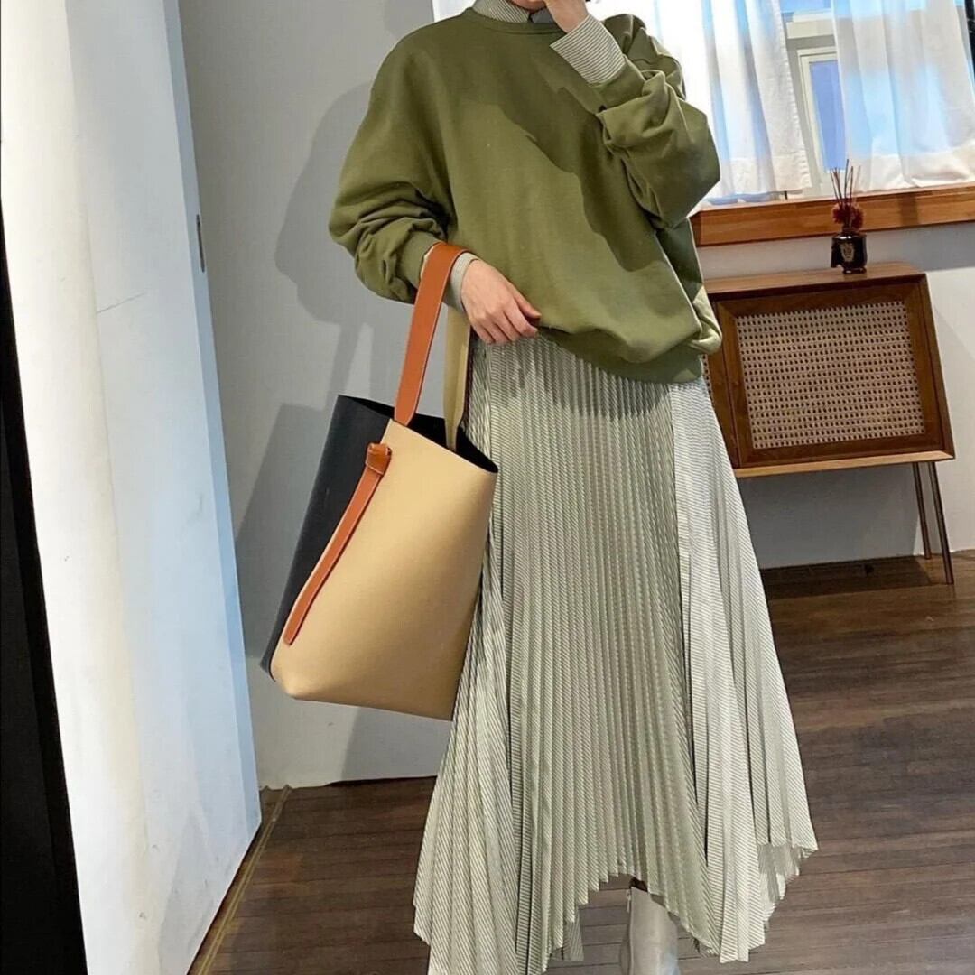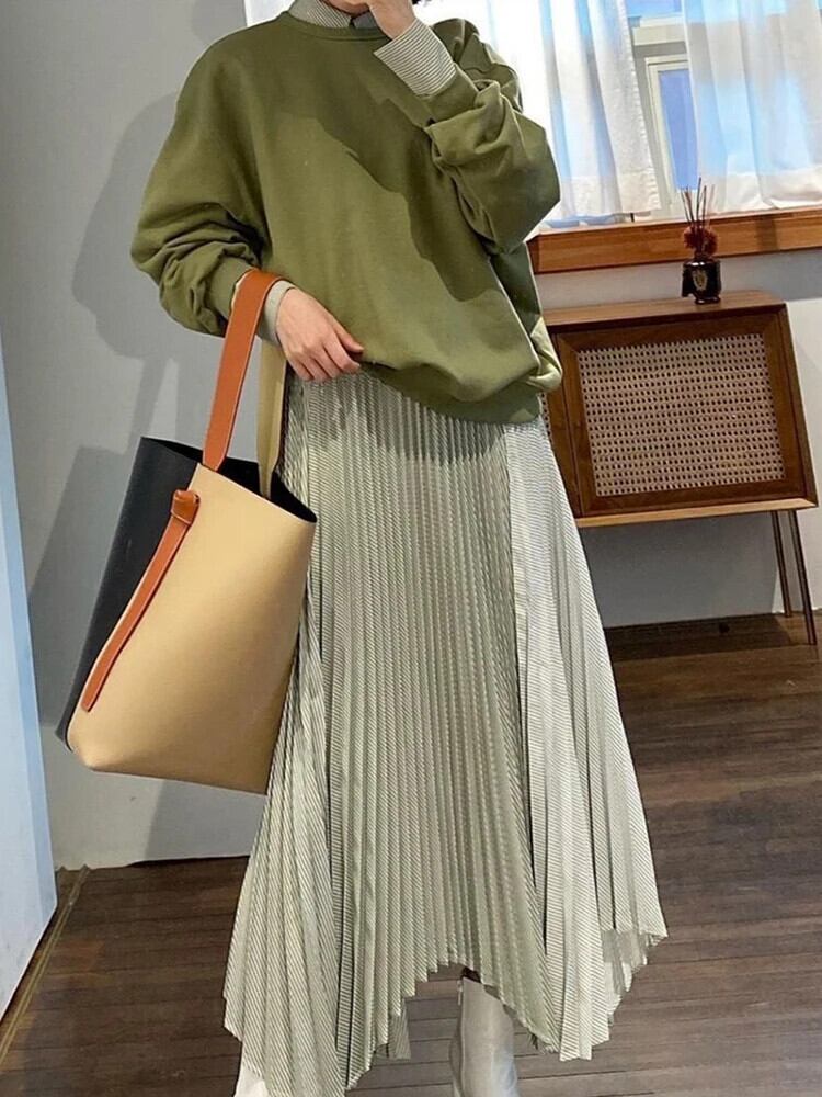 [EWQ] Oネックプルオーバースウェット+ストライプ不規則プリーツパッチワークワンピースレディース秋冬2点セット16U5424 シャツ オータム 秋物 ウィンター 冬物