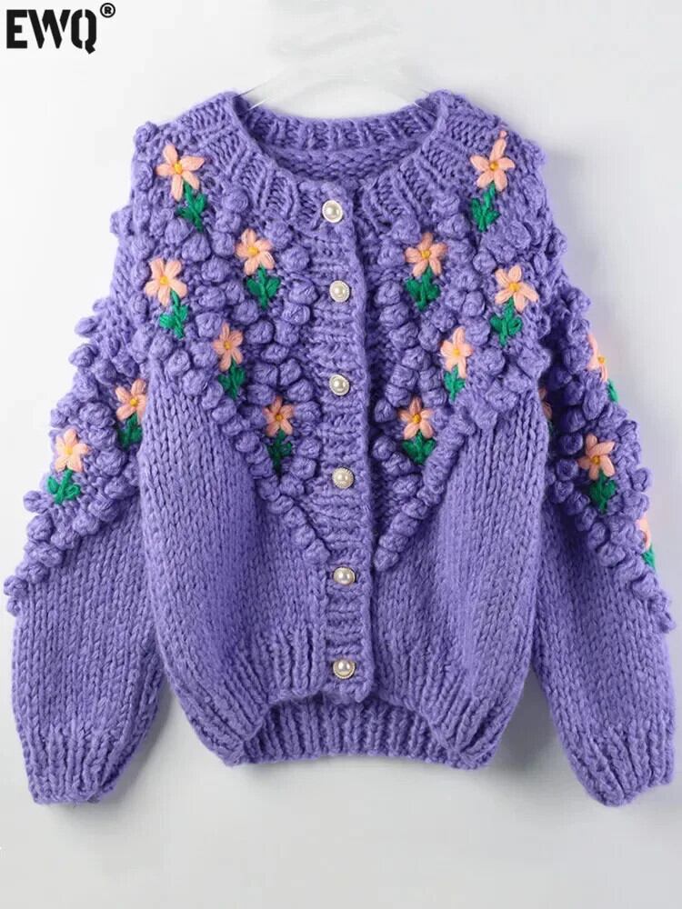 [EWQ] 手作りフックフラワーニットカーディガンコントラスト暖か長袖セータージャケット秋冬 16U5296 ロング オータム 秋物 ウィンター 冬物 フラワーデザイン