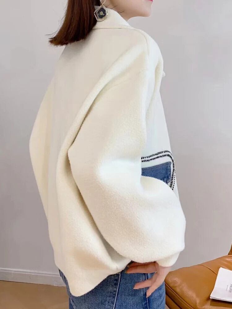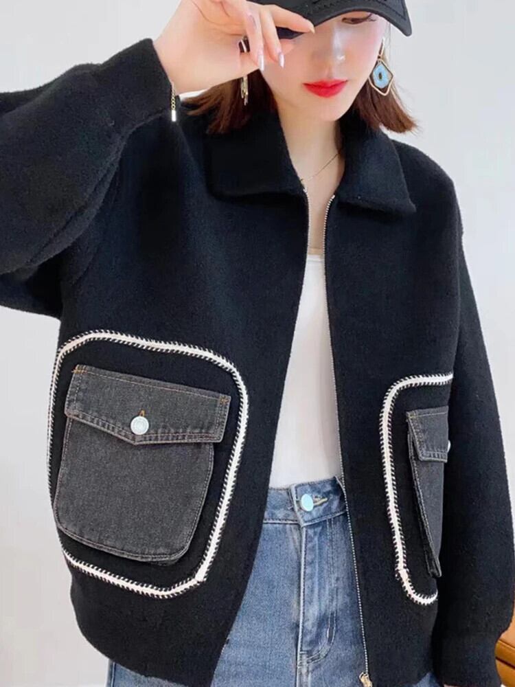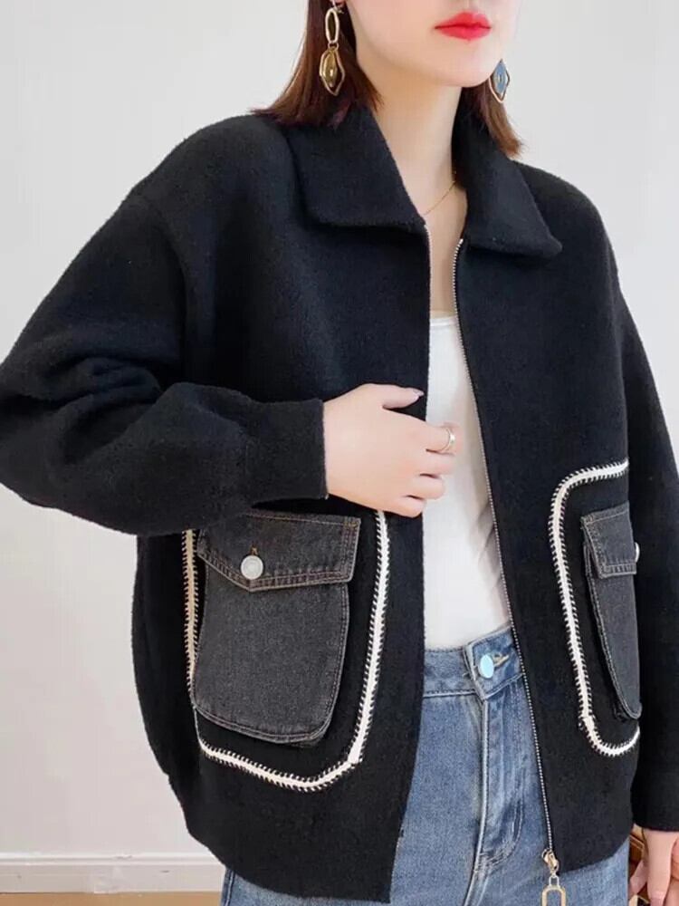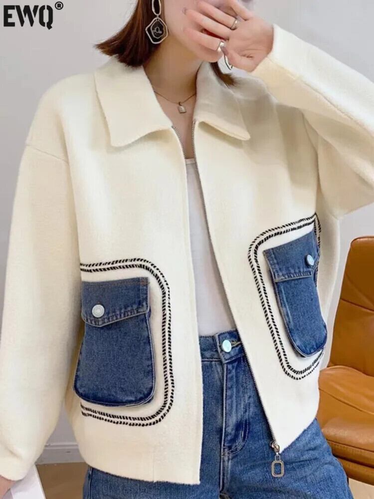 [EWQ] 両面ウールコートデニムスプライスポケット緩い厚手秋冬アウタージャケット 16U5326 オータム 秋物 ウィンター 冬物