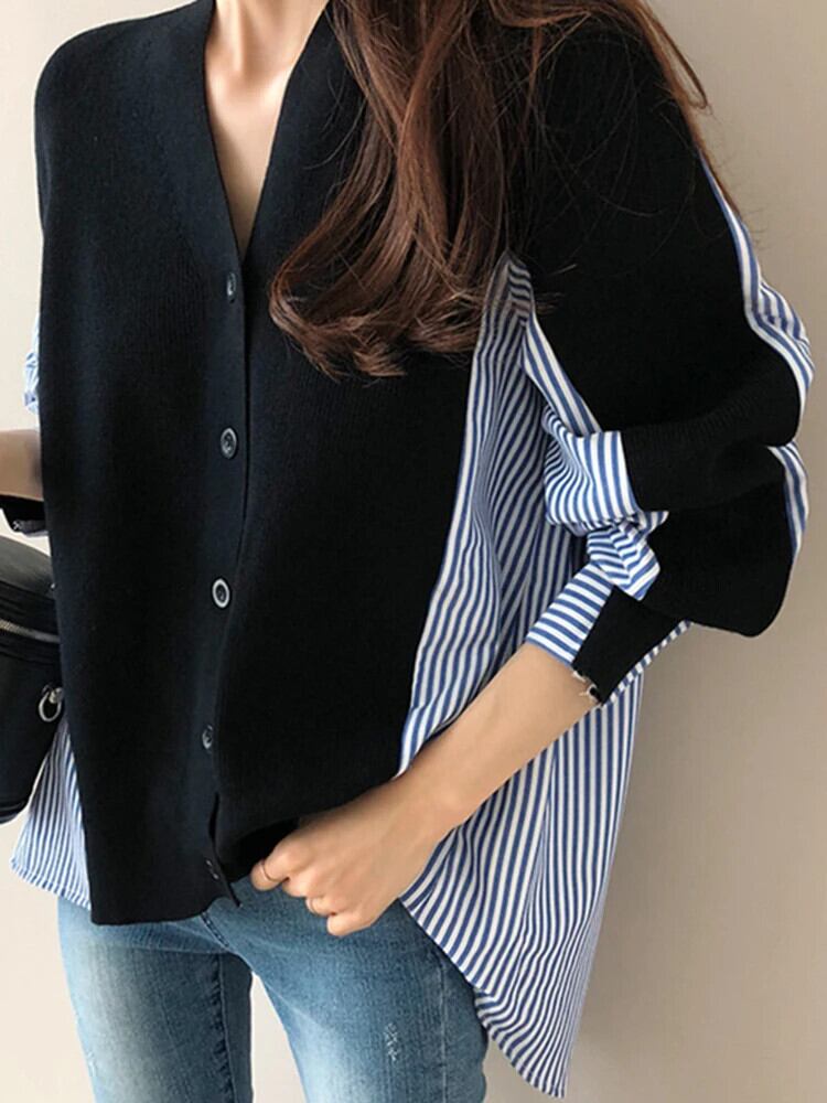 [EWQ]シックコントラストカラーストライプパッチワークVネックシングルブレストカーディガンセーターカジュアルルーズ長袖ニットトップス ロング