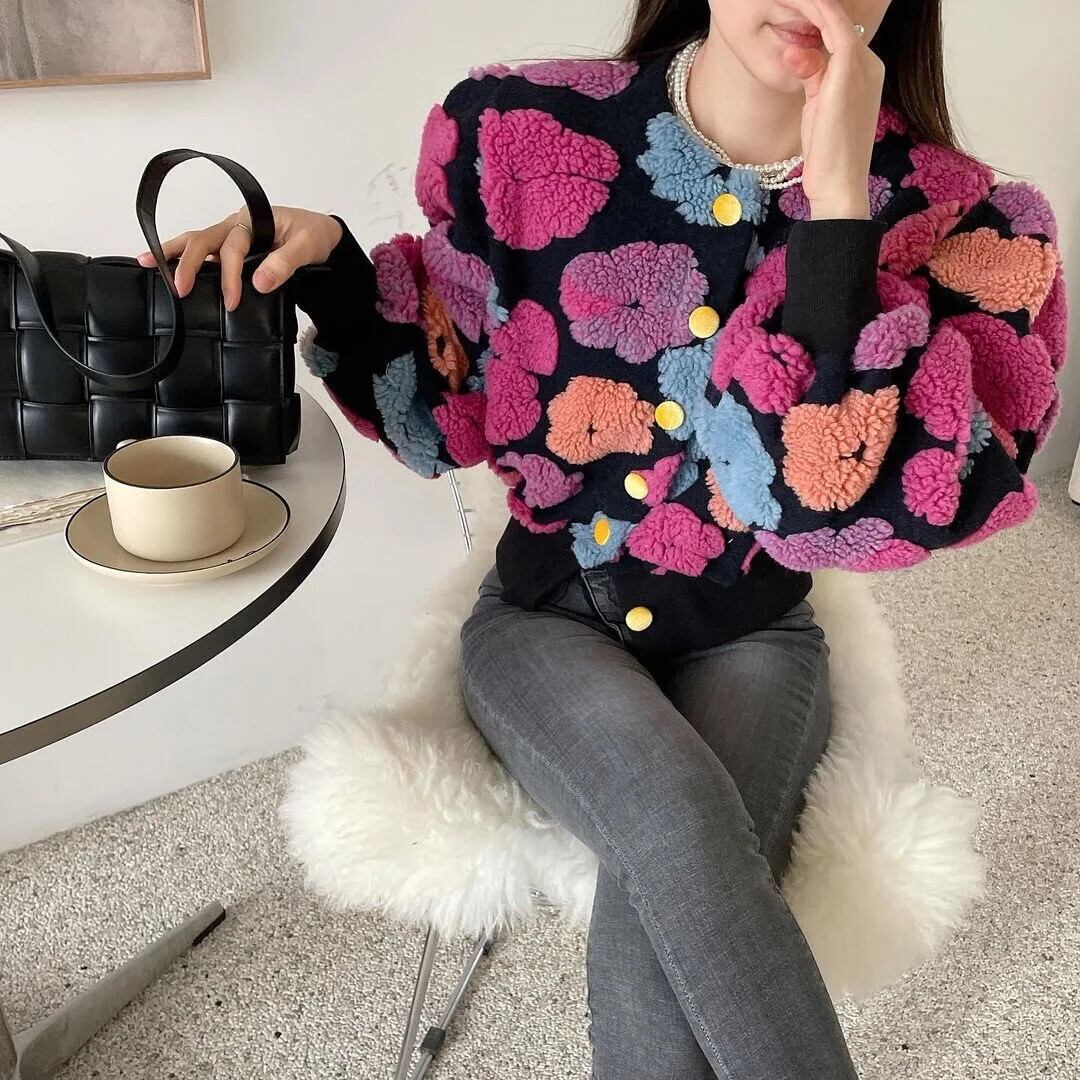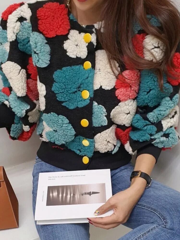 [EWQ] コントラストカラー花 O ネック シングルブレスト ラムウール カーディガン セーター ルーズ ショート コート 秋 オータム 秋物 Oネック フラワーデザイン
