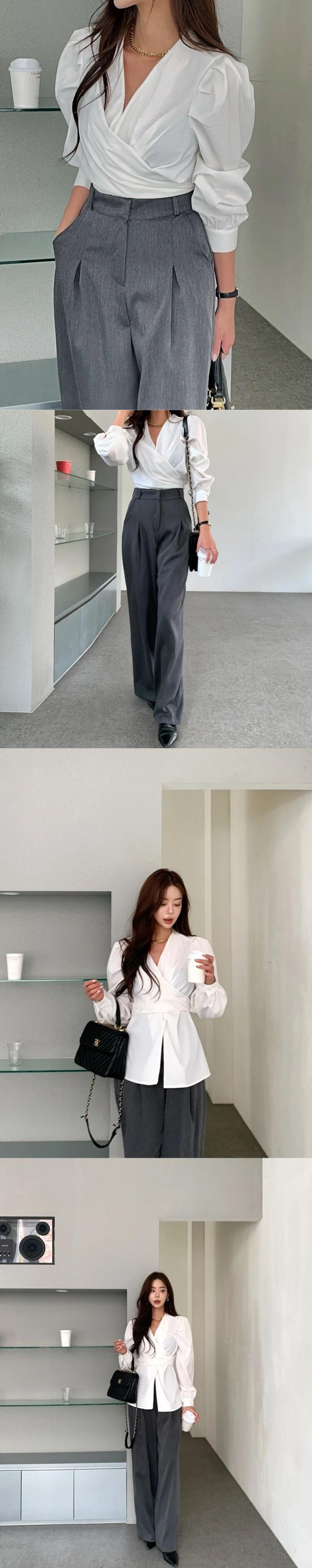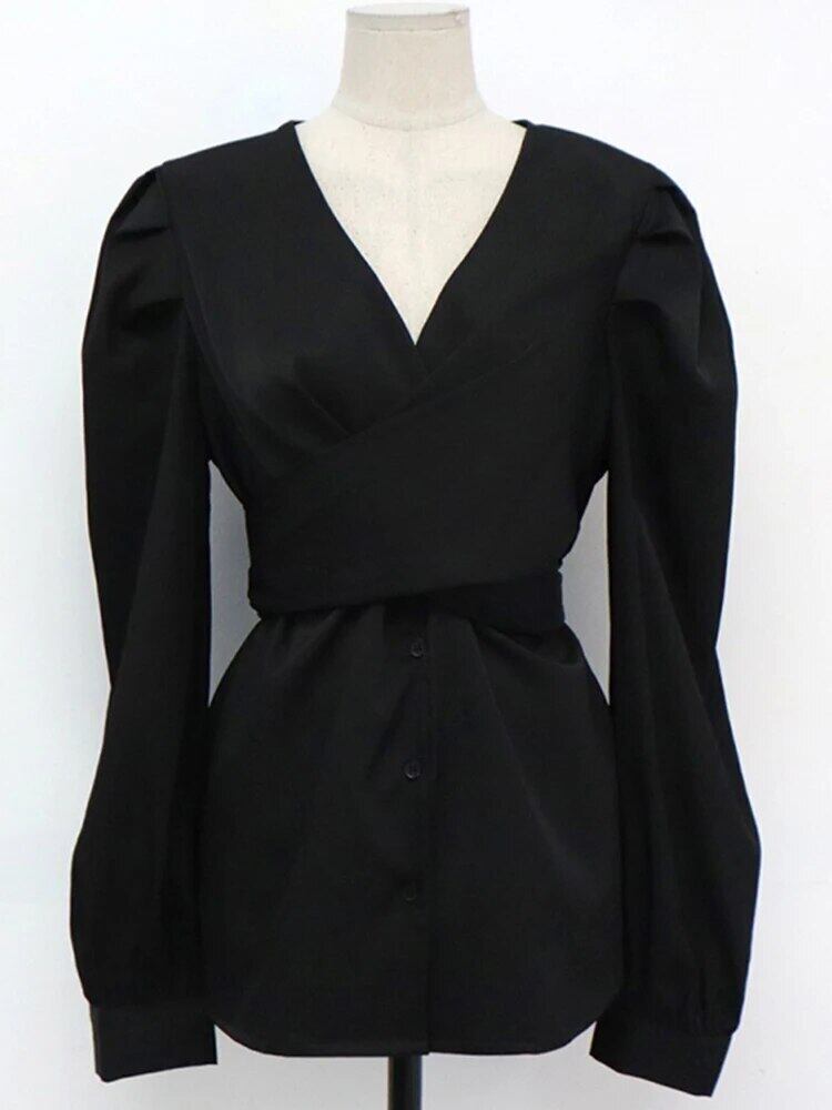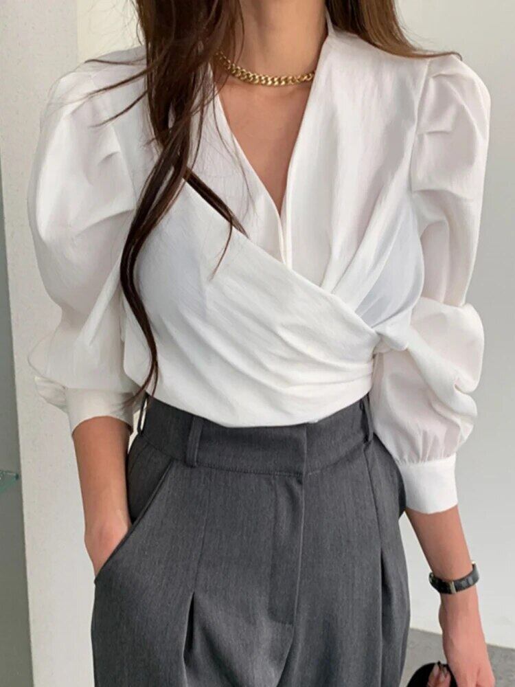[EWQ]イレギュラークロスVネック包帯ウエスト閉じパフノースリーブ白ブラウスカジュアルルーズシフォンシャツ秋冬 ホワイト オータム 秋物 ウィンター 冬物
