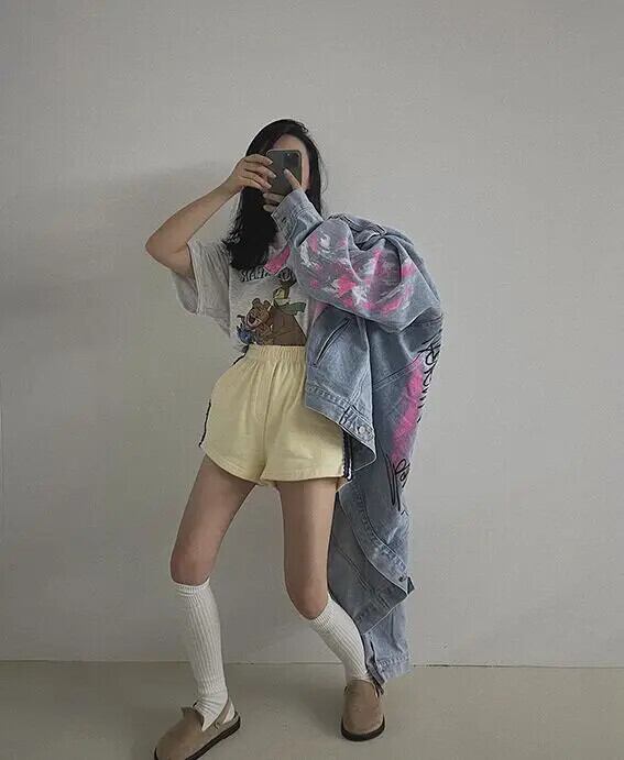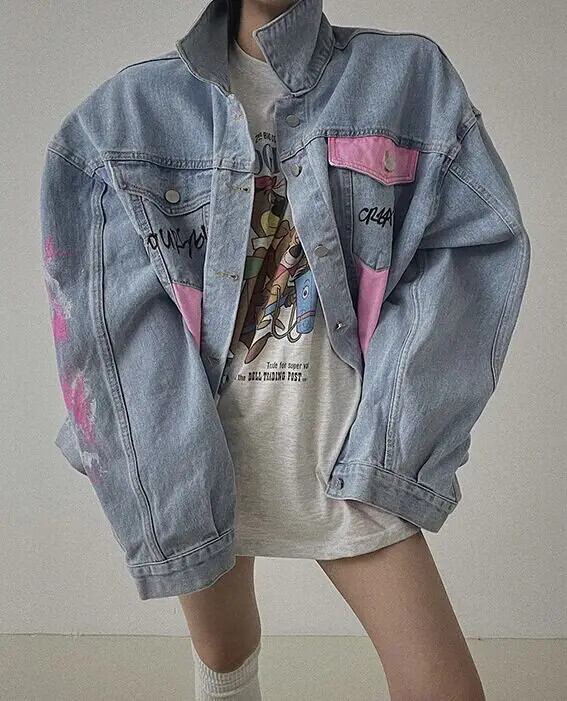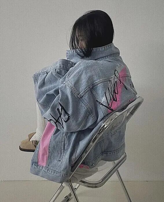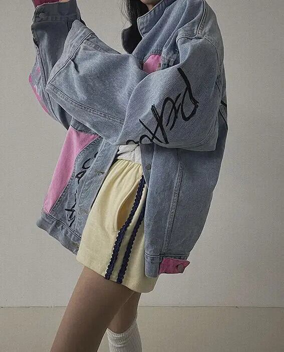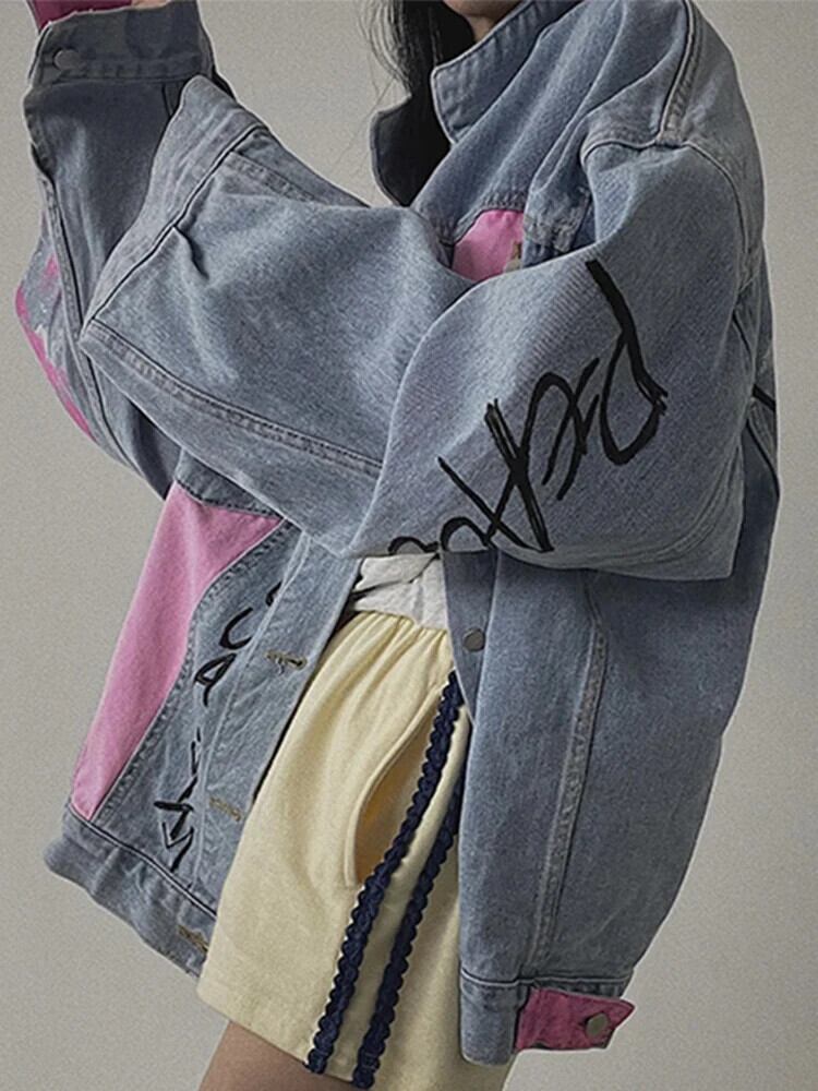 [EWQ] ストリートコントラストカラーピンクラペルシングルブレストデニムコートレタープリントジャケット秋冬 オータム 秋物 ウィンター 冬物