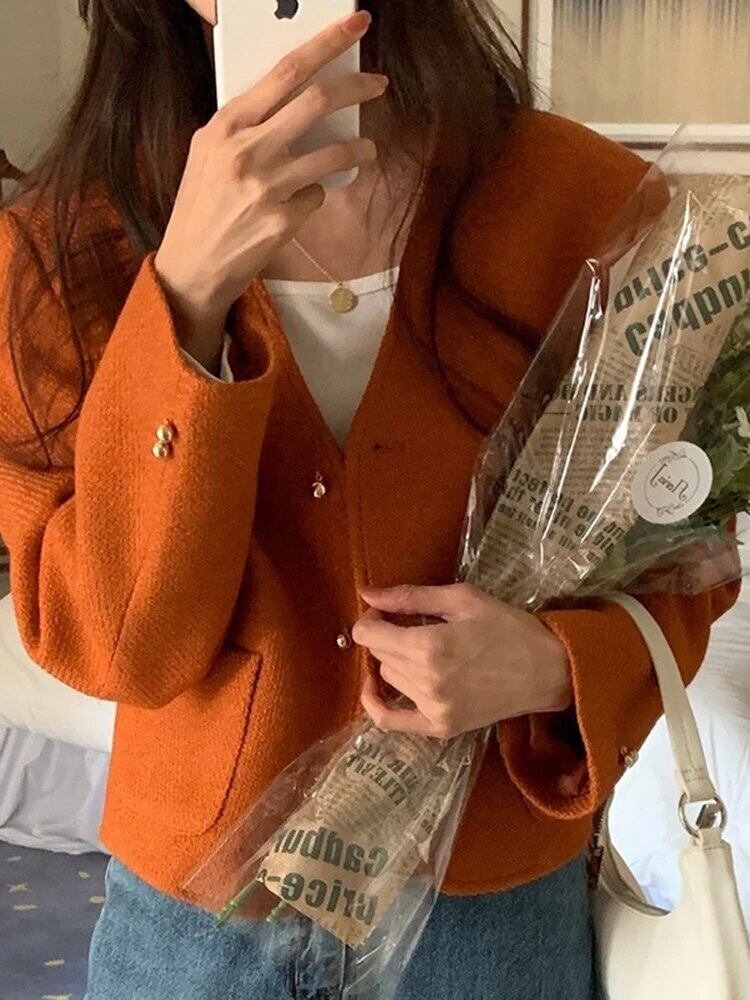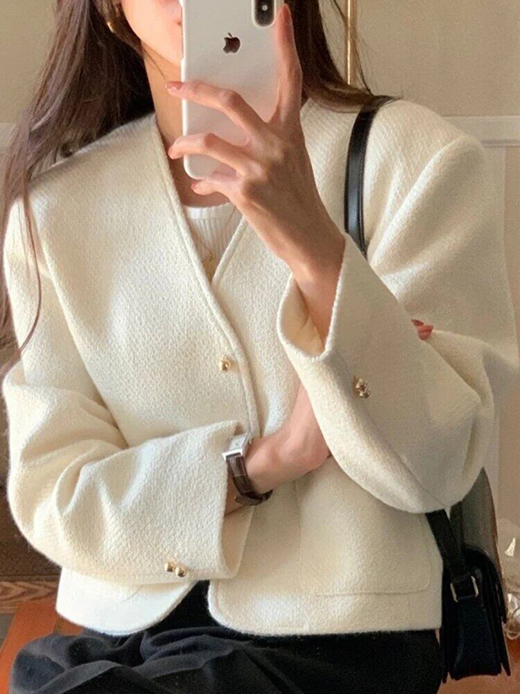 [EWQ] ルーズ V ネックシングルブレストウールコートシック長袖ショートジャケット秋冬 ロング オータム 秋物 ウィンター 冬物 Vネック