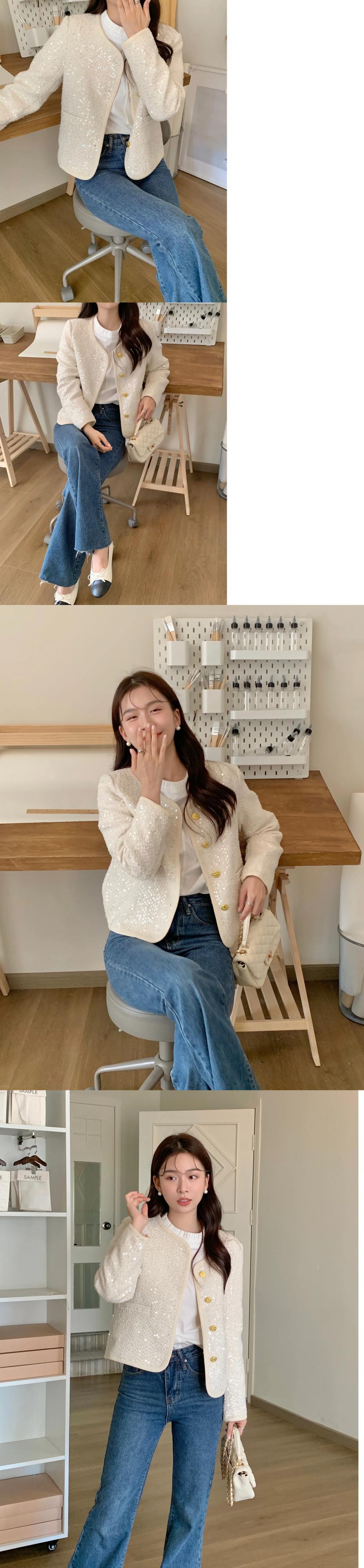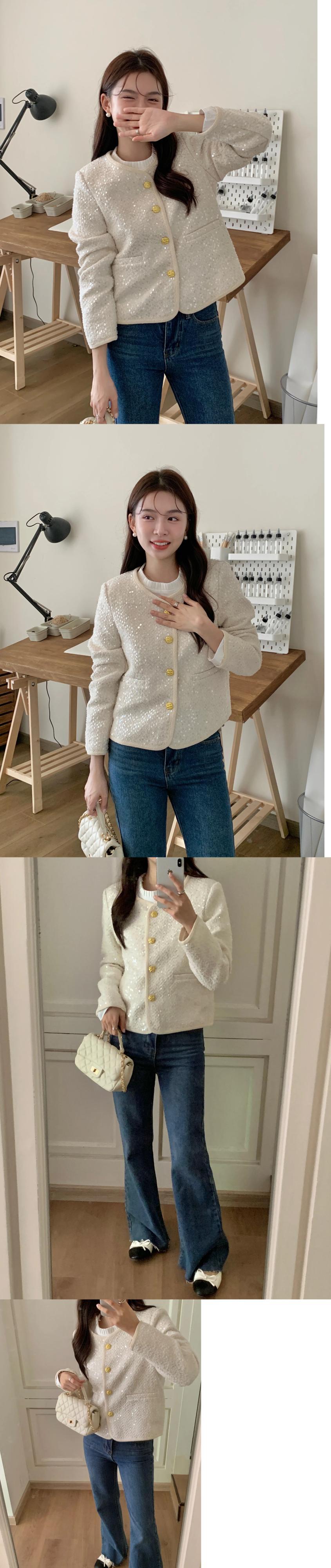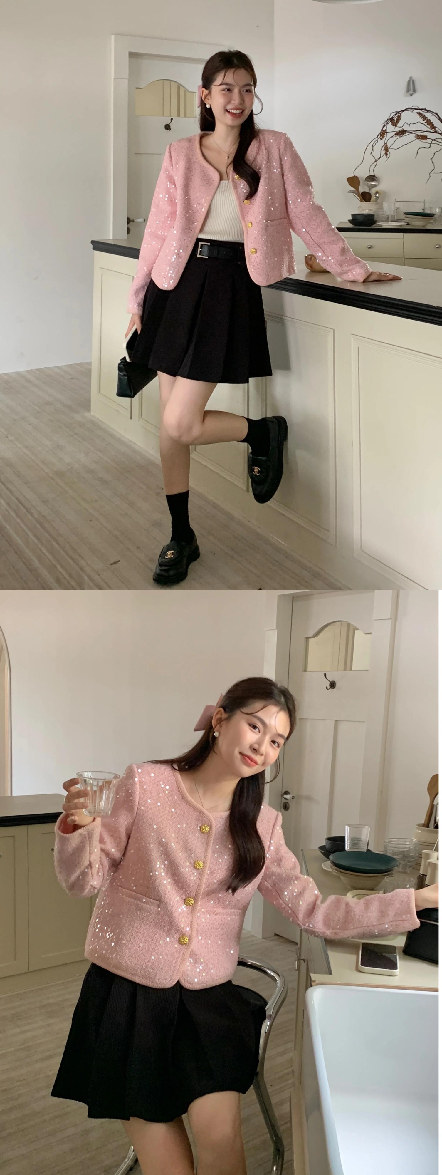 [EWQ] 甘いピンクスパンコール O ネックゴールドボタンショートコートルーズ長袖ジャケット秋冬 16U5657 ロング 大人ガーリー スウィート キュート カジュアル オータム 秋物 ウィンター 冬物 Oネック