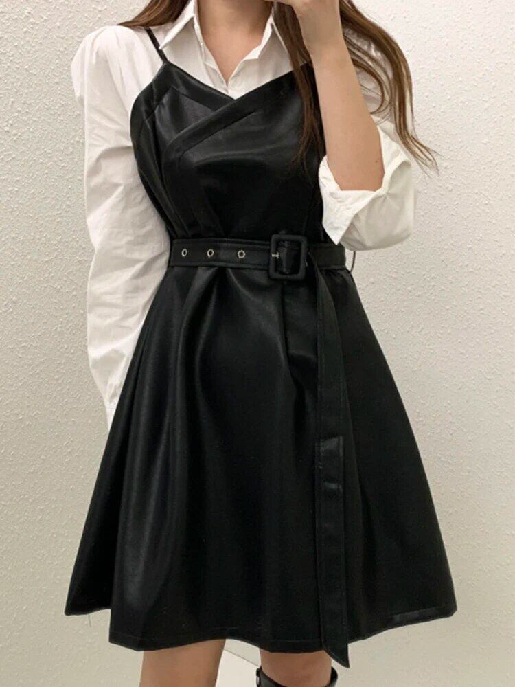 [EWQ] ストリート PU レザー パッチワーク フェイク ツーピース ドレス スリム フィット ウエスト開閉 ロング ノースリーブ Vestidos 秋冬 長袖 オータム 秋物 ウィンター 冬物