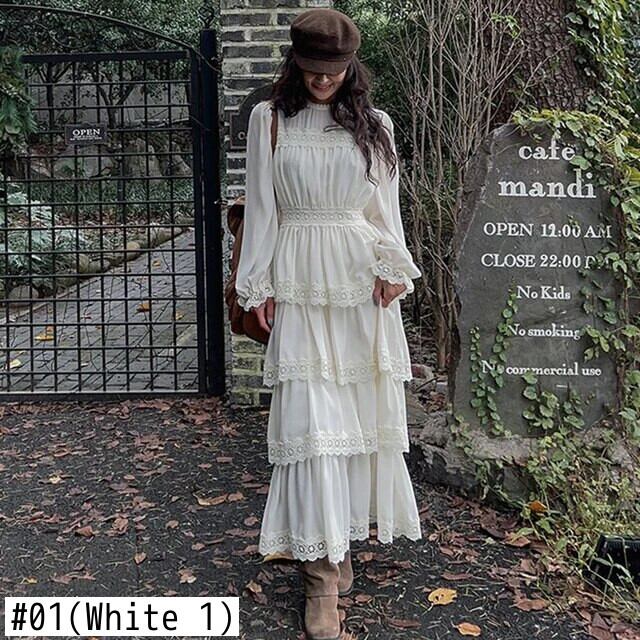 [EWQ] シック O ネックロングノースリーブレースレースルックホワイトドレスルーズミッドロングイブニング Vestidos 秋冬 長袖 オータム 秋物 ウィンター 冬物 Oネック
