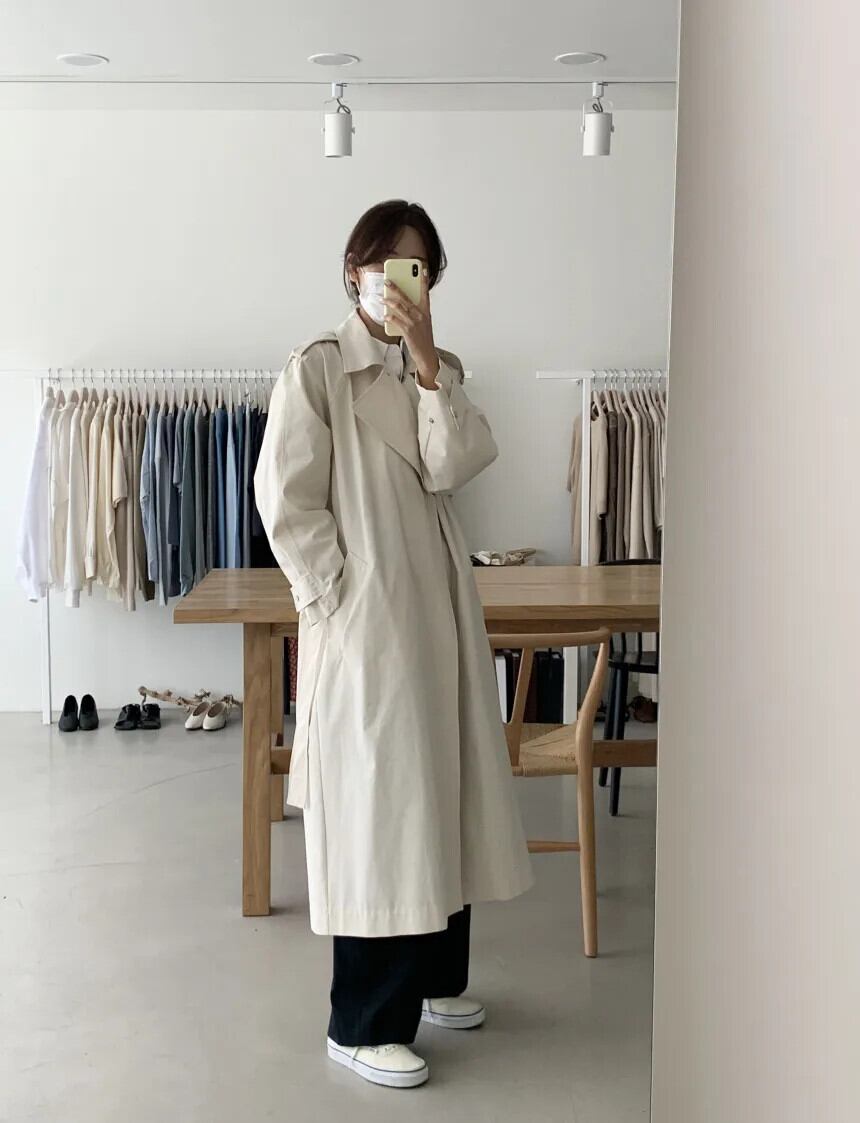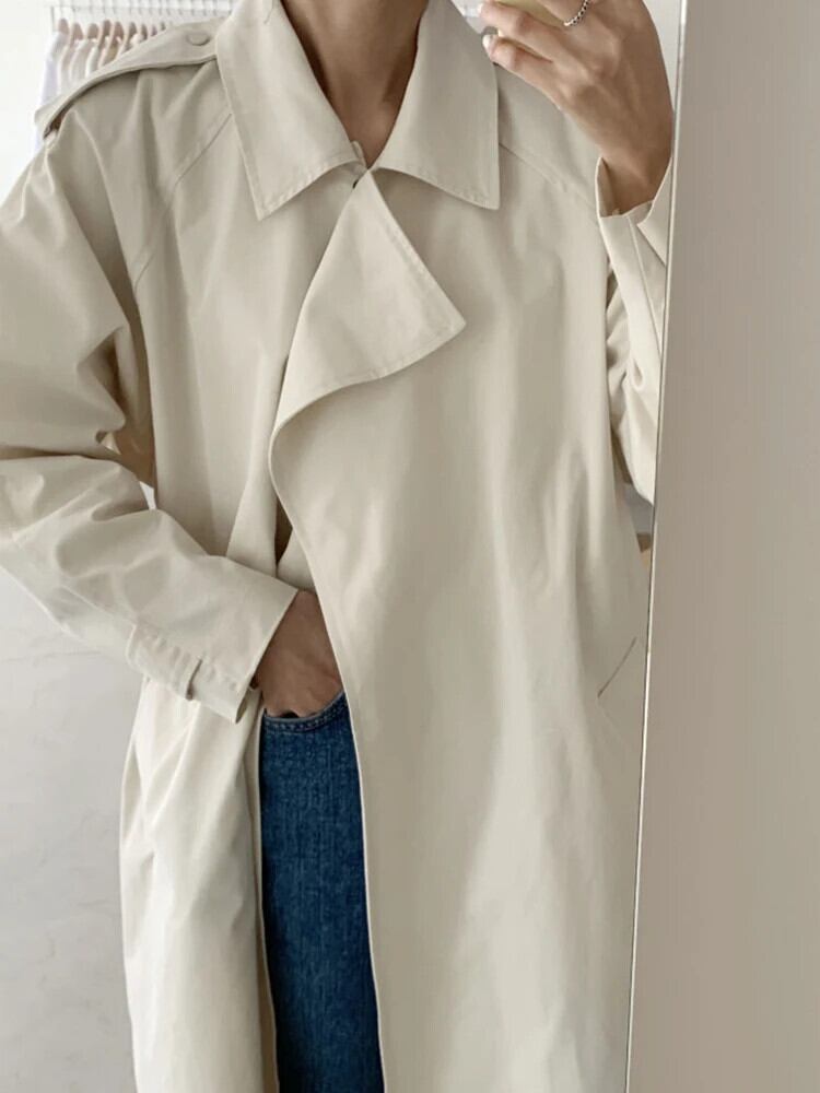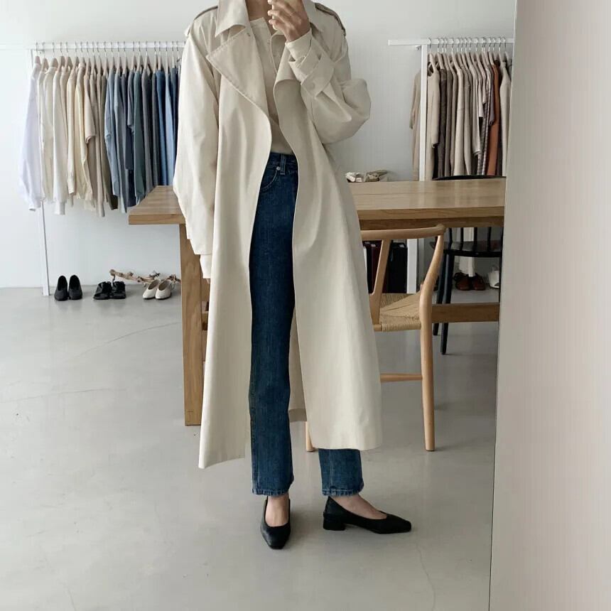 [EWQ] 気質クリーミーホワイトノッチ長袖トレンチコートベルト付きルーズウインドブレーカー秋冬 16U5584 ロング オータム 秋物 ウィンター 冬物 ハーネス