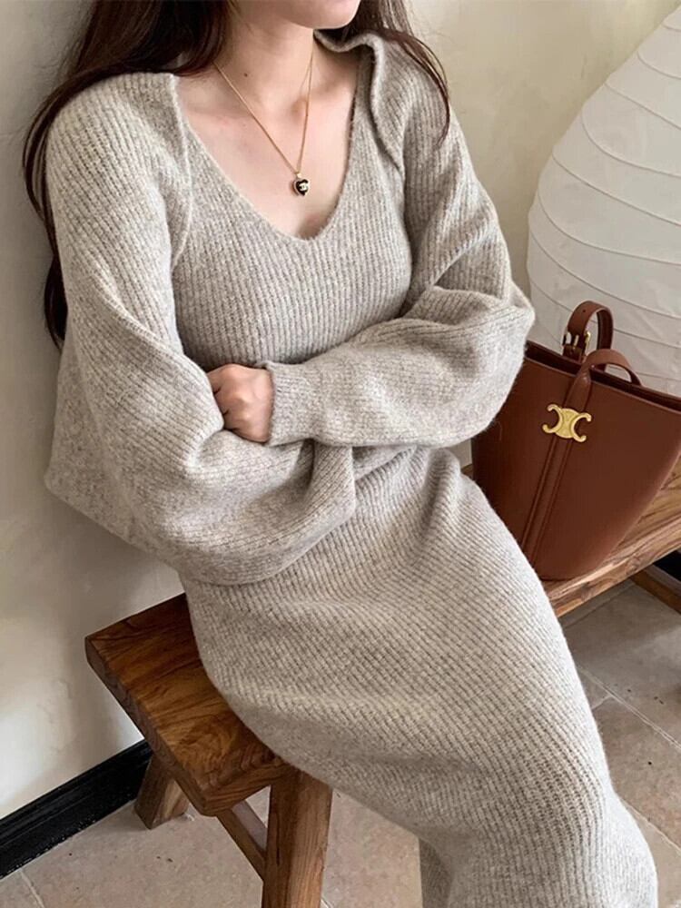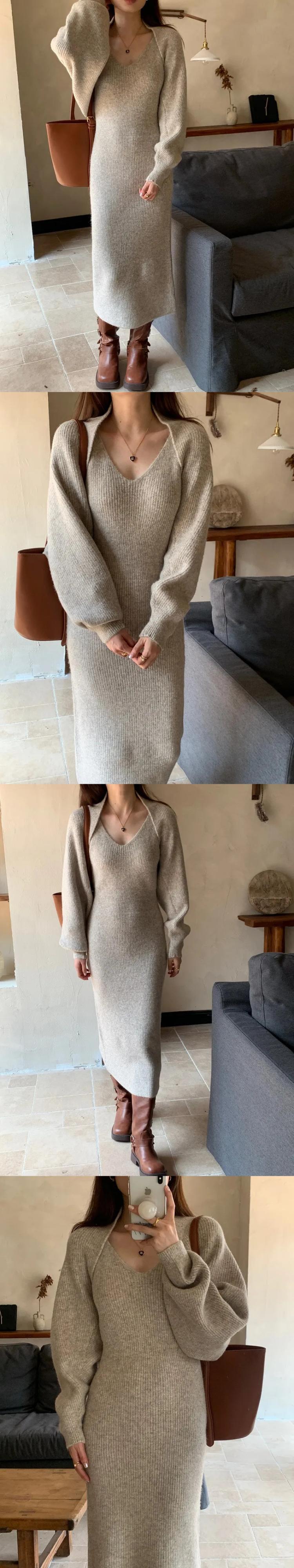 [EWQ]シック2点セット ショール ノースリーブ ニットワンピース 秋 ニットスーツ 秋冬 オータム 秋物 ウィンター 冬物