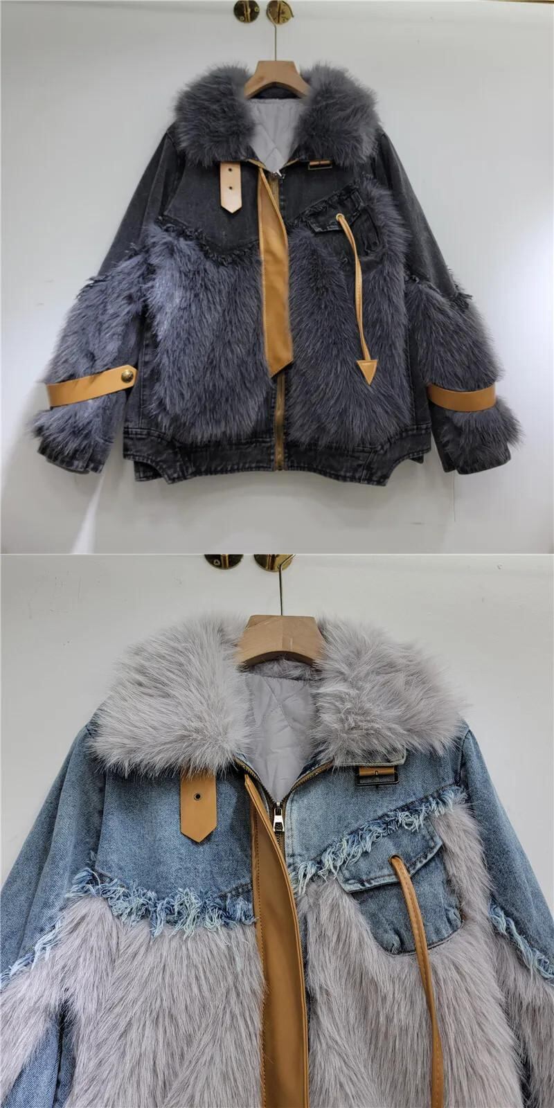 [EWQ] ストリートシックフェイクファー襟パッチワークジッパー厚く暖かいデニムコートルーズ長袖ジャケット秋 ロング オータム 秋物