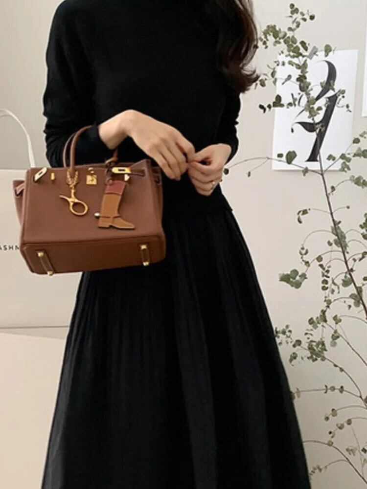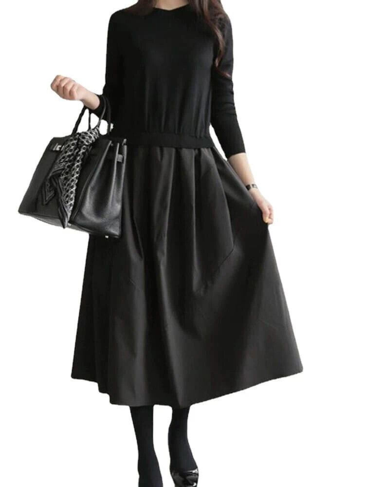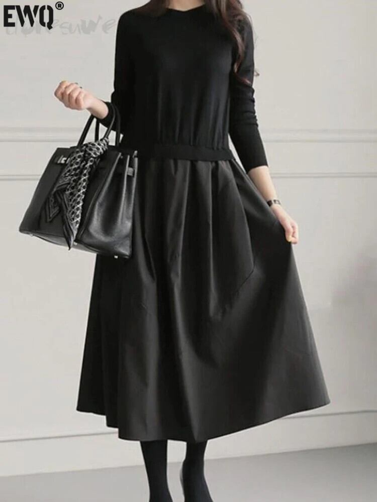 [EWQ] 冬セーターパッチワークドレス黒長袖スリムチェック柄コントラストニットドレス Vestido 秋 16U5196 ロング ブラック オータム 秋物 ウィンター 冬物