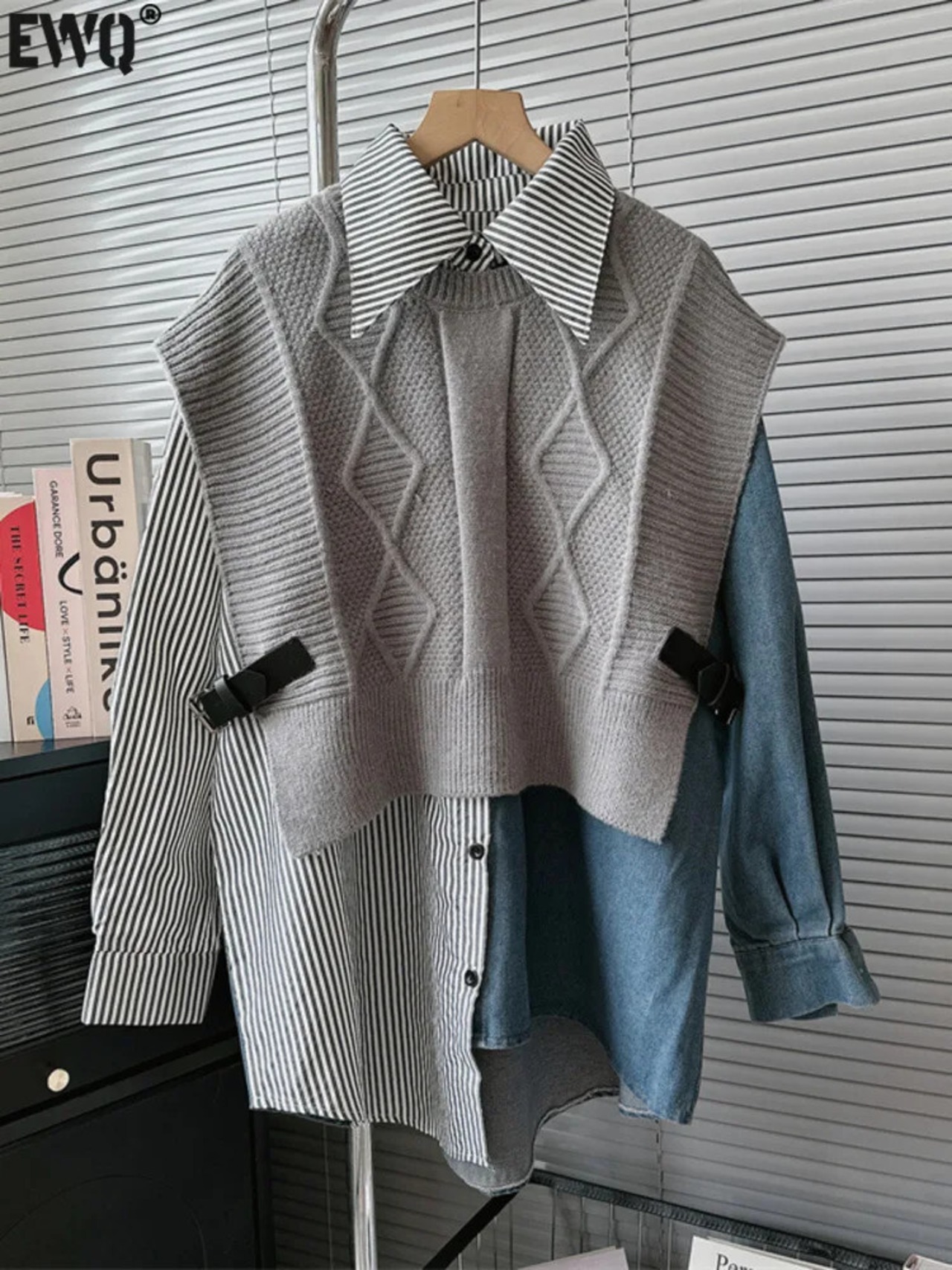 [EWQ] デニムスプライスシャツストリートルーズノースリーブレザーバックルニットベスト秋冬 16U5259 オータム 秋物 ウィンター 冬物