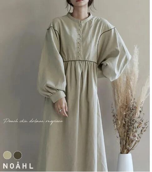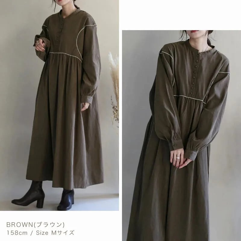 【EWQ】シックスタンドネックシングルブレスト長袖コントラストカラーゆったり長袖ワンピース秋冬 ロング オータム 秋物 ウィンター 冬物