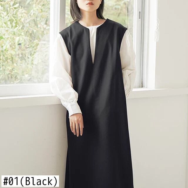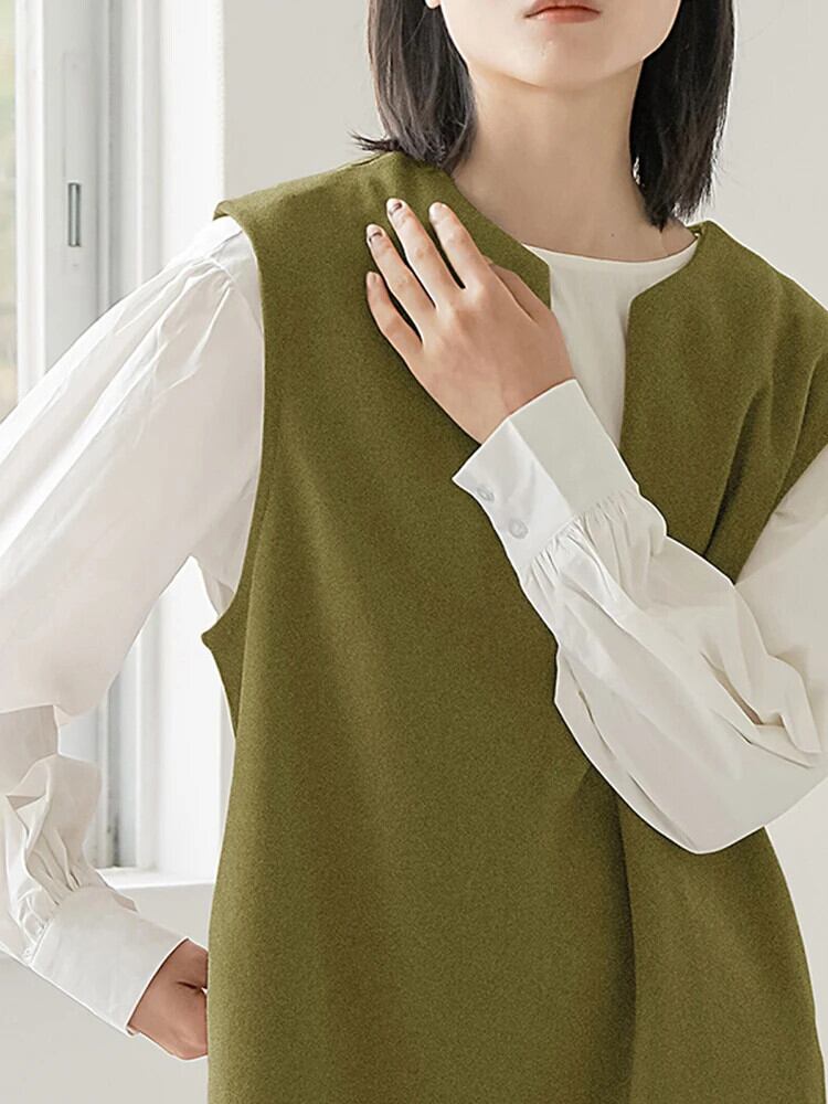 [EWQ] シック ルーズ O ネック スプリット ノースリーブ プルオーバー ベスト ドレス ルーズ シンプル ミドル ロング Vestidos 秋冬 オータム 秋物 ウィンター 冬物 Oネック