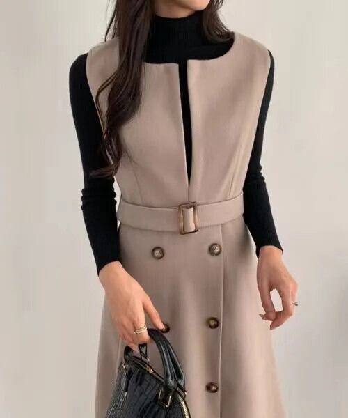 [EWQ]シックOネックスプリットノースリーブダブルブレストウールワンピースゆったりミドルロングワンピース秋冬 オータム 秋物 ウィンター 冬物
