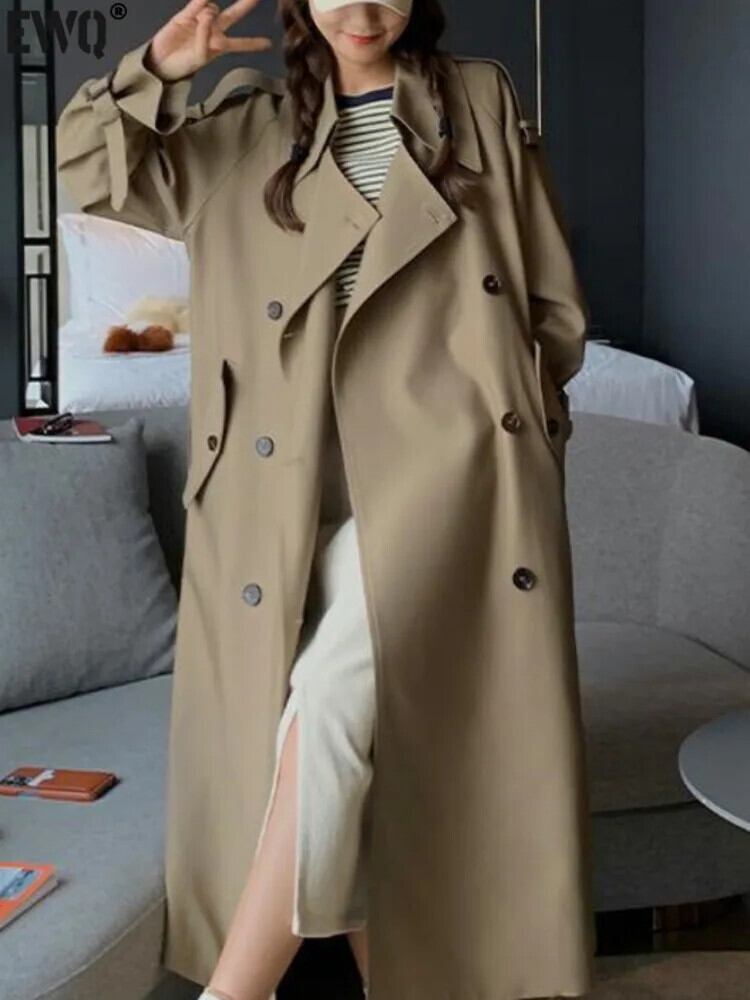 [EWQ] 不規則バック包帯トレンチコート長袖ダブルブレストウインドブレーカージャケット秋冬潮 ロング オータム 秋物 ウィンター 冬物