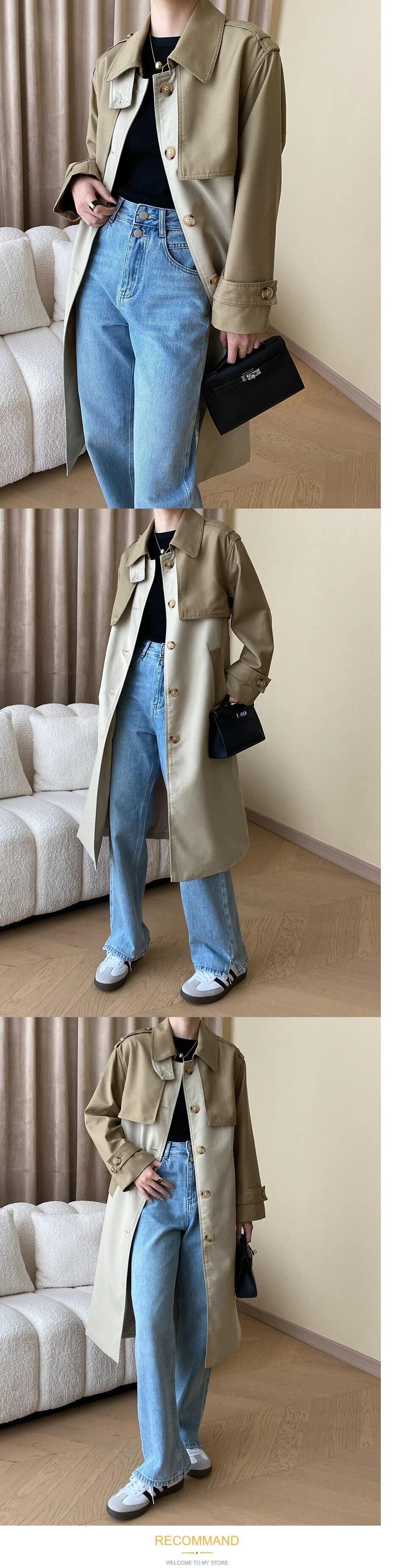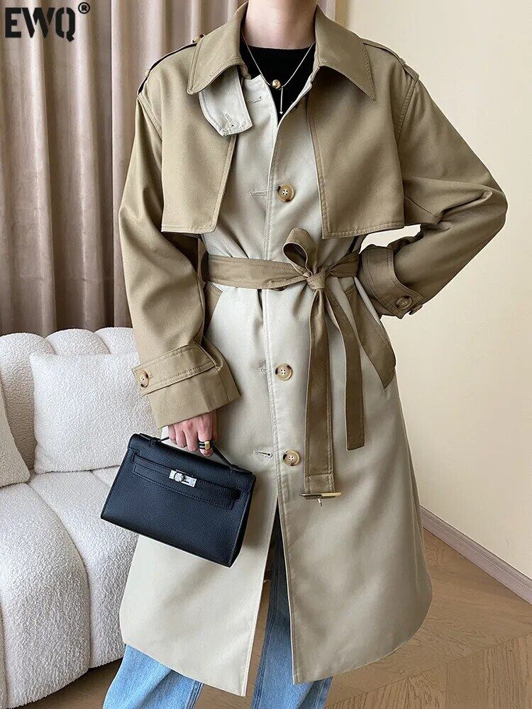 [EWQ] パッチワークコントラスト包帯ウインドブレーカージャケット長袖シングルブレストルーズトレンチコート秋 U2465 ロング オータム 秋物