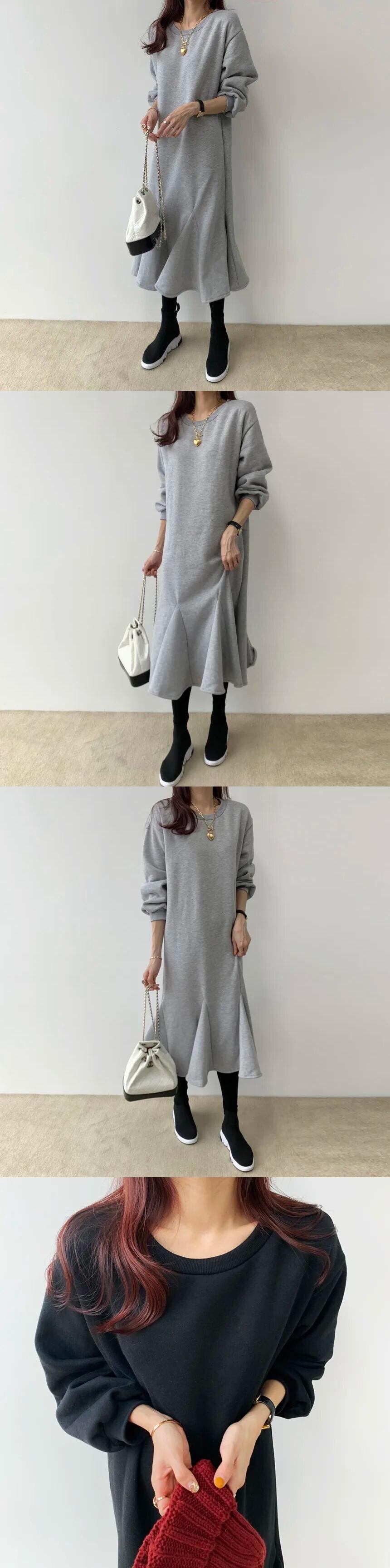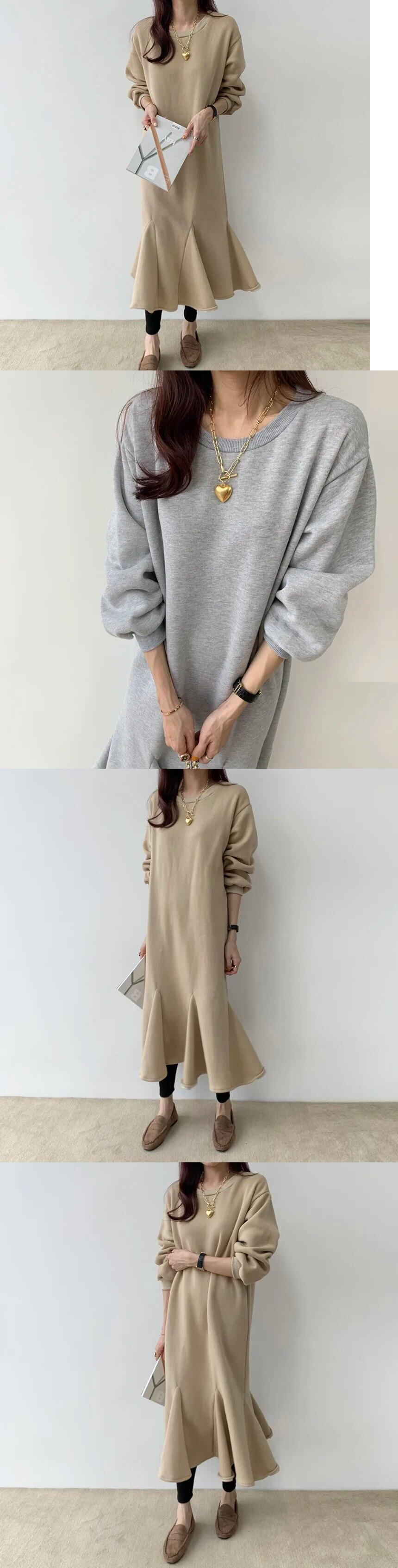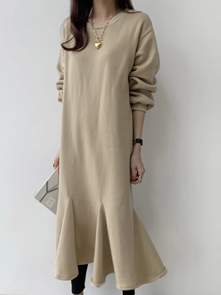 [EWQ] シンプルソリッド O ネック長袖プルオーバードレスルーズミッドロングフィッシュテールスウェットシャツ Vestidos 秋冬 オータム 秋物 ウィンター 冬物 Oネック ソリッドカラー