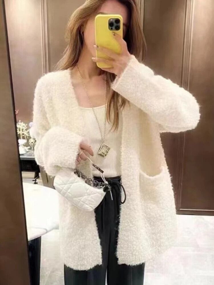 [EWQ] ダブルポケットカーディガンコート長袖ルーズソフトセータージャケット秋冬オープンステッチコート 16U4220 ロング オータム 秋物 ウィンター 冬物