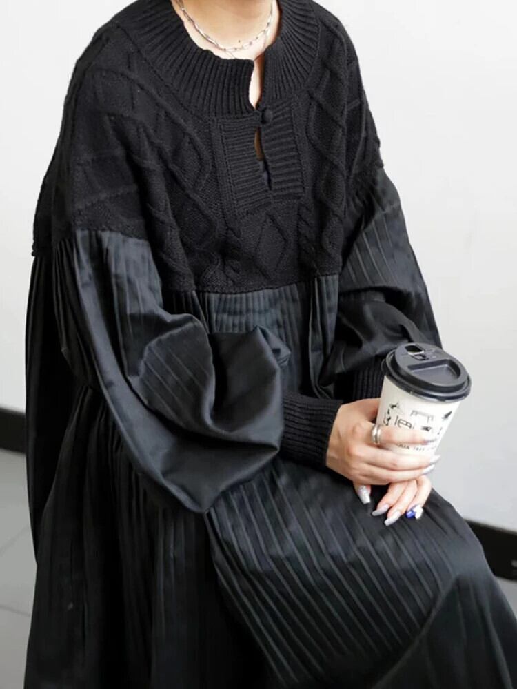 [EWQ] ブラックニットパッチワーク長袖プルオーバードレスルーズミッドロング Vestidos 秋冬 オータム 秋物 ウィンター 冬物