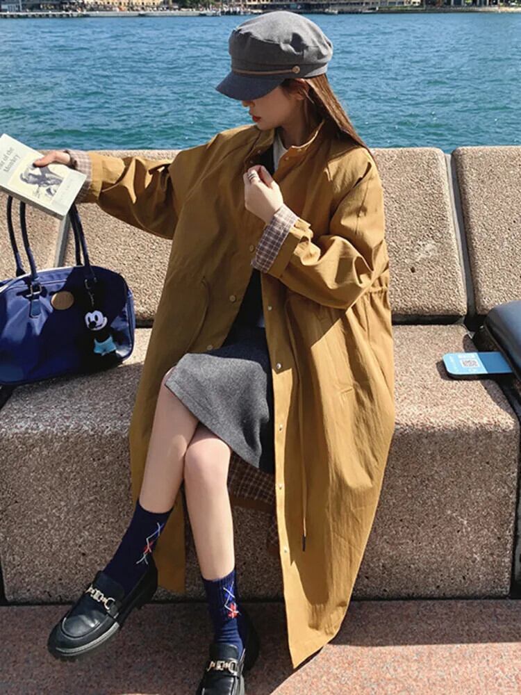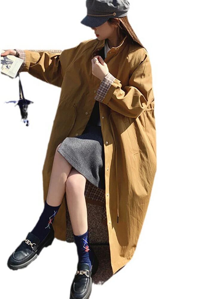 [EWQ] イエロー トレンチ コート レディース 長袖 ストライプ パッチワーク ルーズ ウインドブレーカー ジャケット 秋冬 16U5335 ロング オータム 秋物 ウィンター 冬物