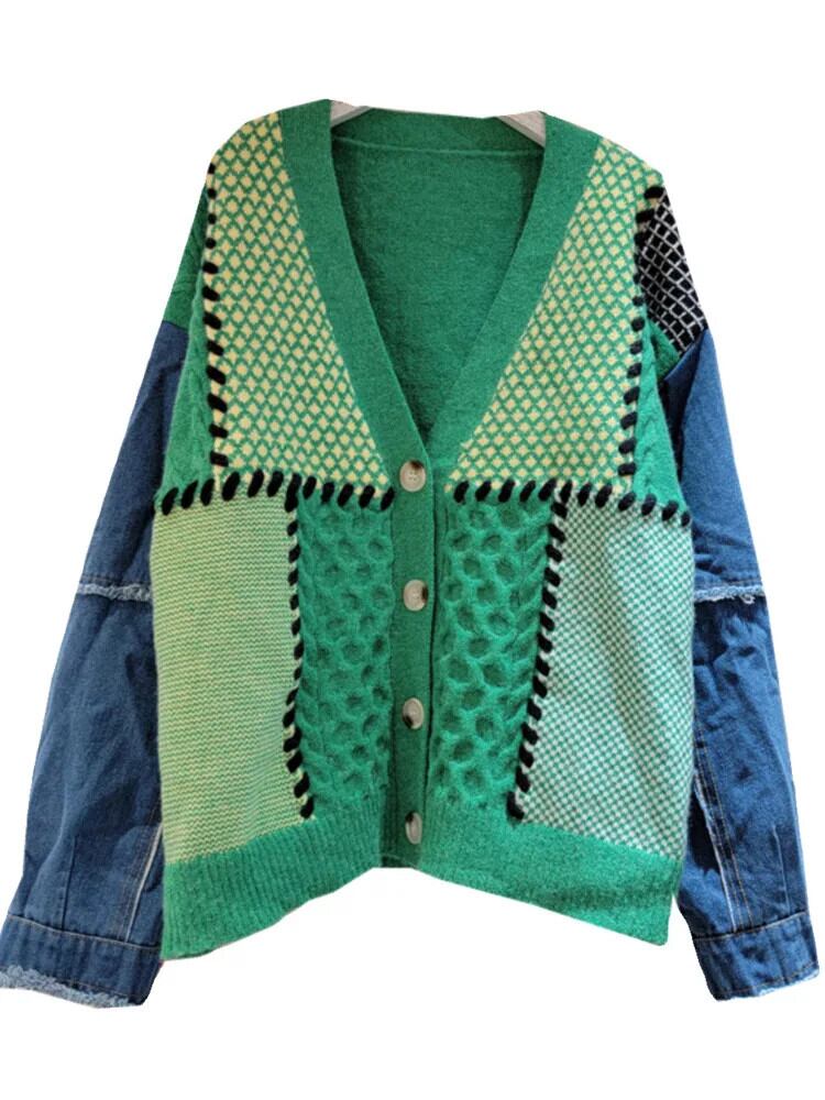 [EWQ]シックコントラストカラートップステッチVネックシングルブレスト長袖カーディガンセータールーズニットトップス ロング