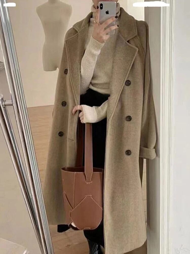 [EWQ] ウール コート ダブルブレスト ベルト付き 長袖 暖かい ウール アウター オーバーコート 秋冬 潮 16U5282 ロング オータム 秋物 ウィンター 冬物 ハーネス