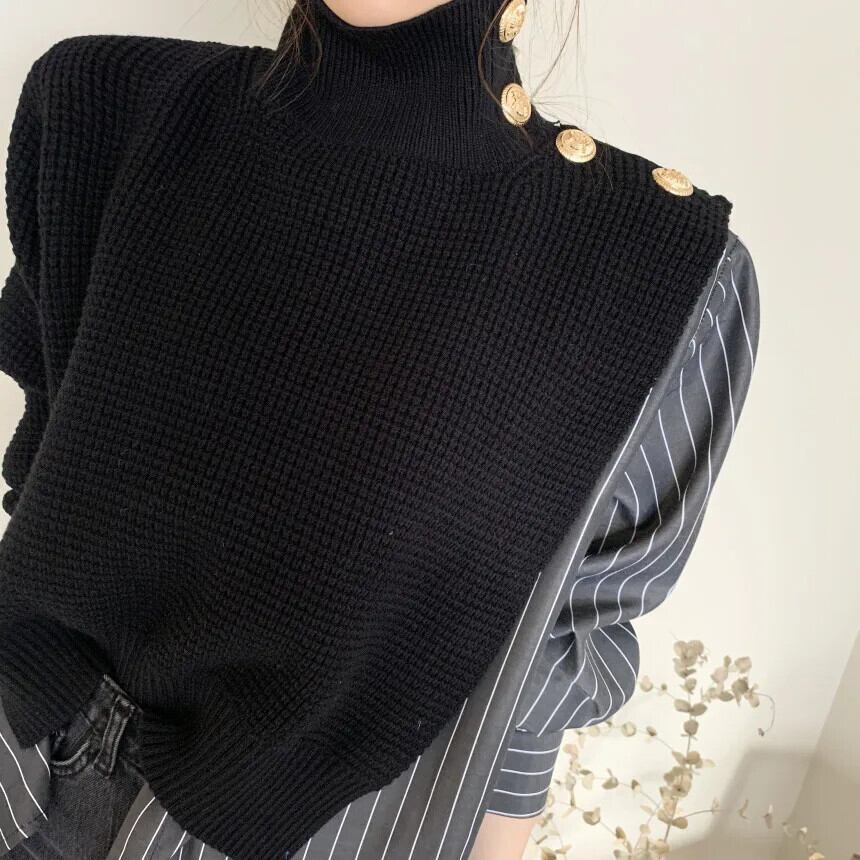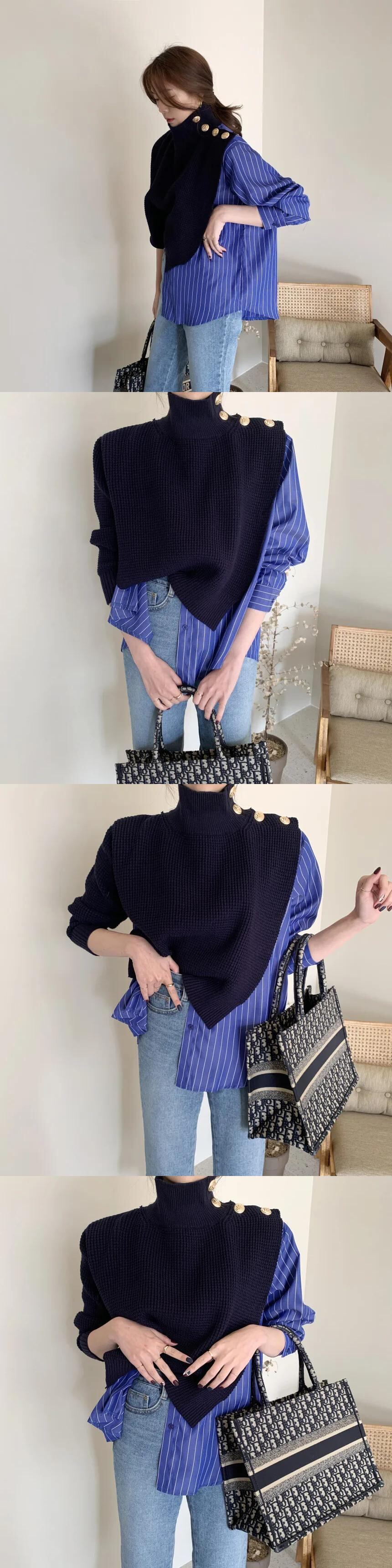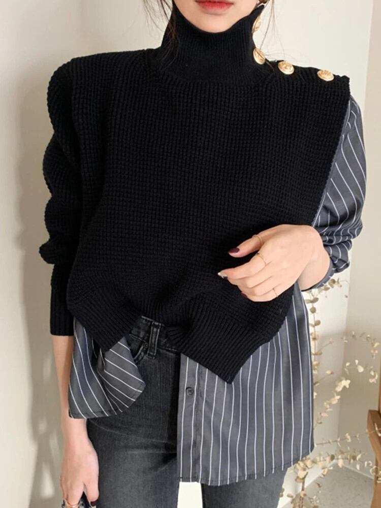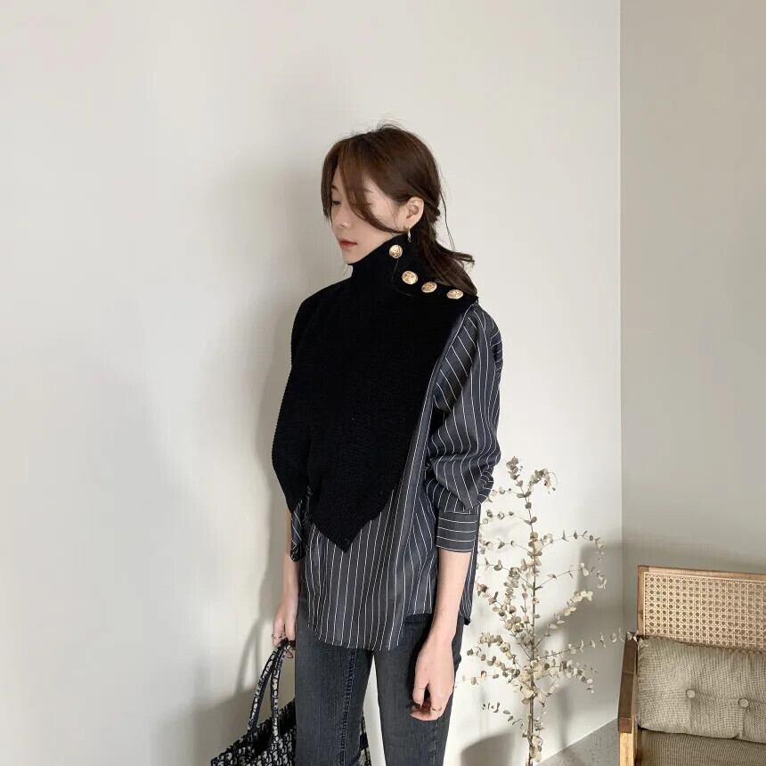 [EWQ] フェイク 2 ピース セーター タートルネック ストライプ シャツ スプライス プルオーバー ニット トップ 秋冬 16U5433 オータム 秋物 ウィンター 冬物