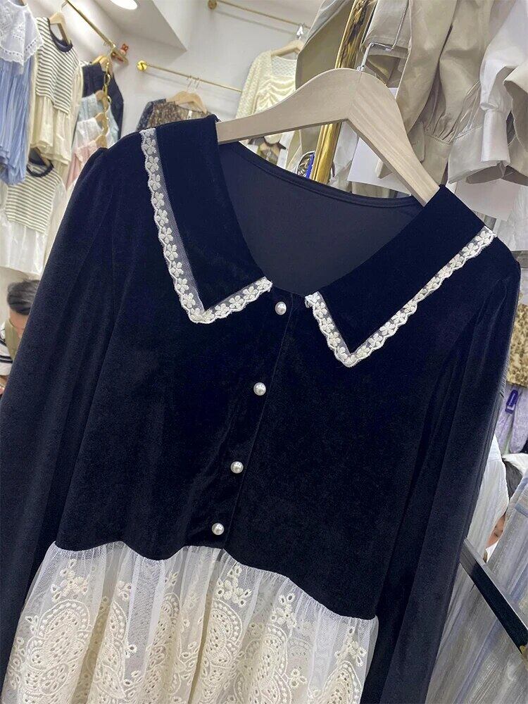 [EWQ] レースパッチワークフレンチベルベットシャツ長袖シングルブレストルーズトップ秋冬 16U4809 ロング オータム 秋物 ウィンター 冬物