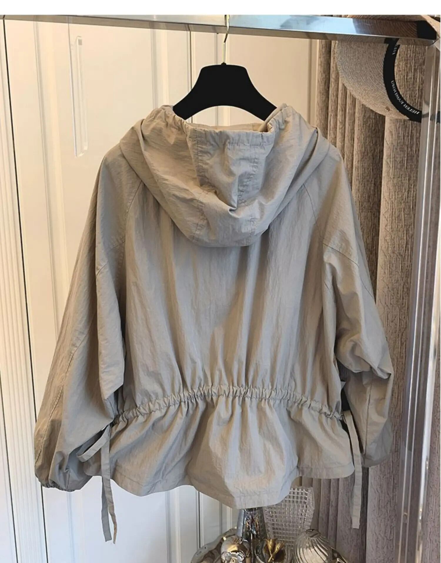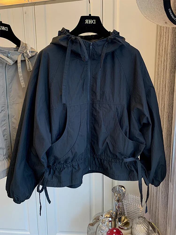 [EWQ] バットウィングスリーブフリルフード付きコート秋冬潮弾性プリーツウエストルーズジャケットコート 16U4968 エラスティック 伸縮 オータム 秋物 ウィンター 冬物