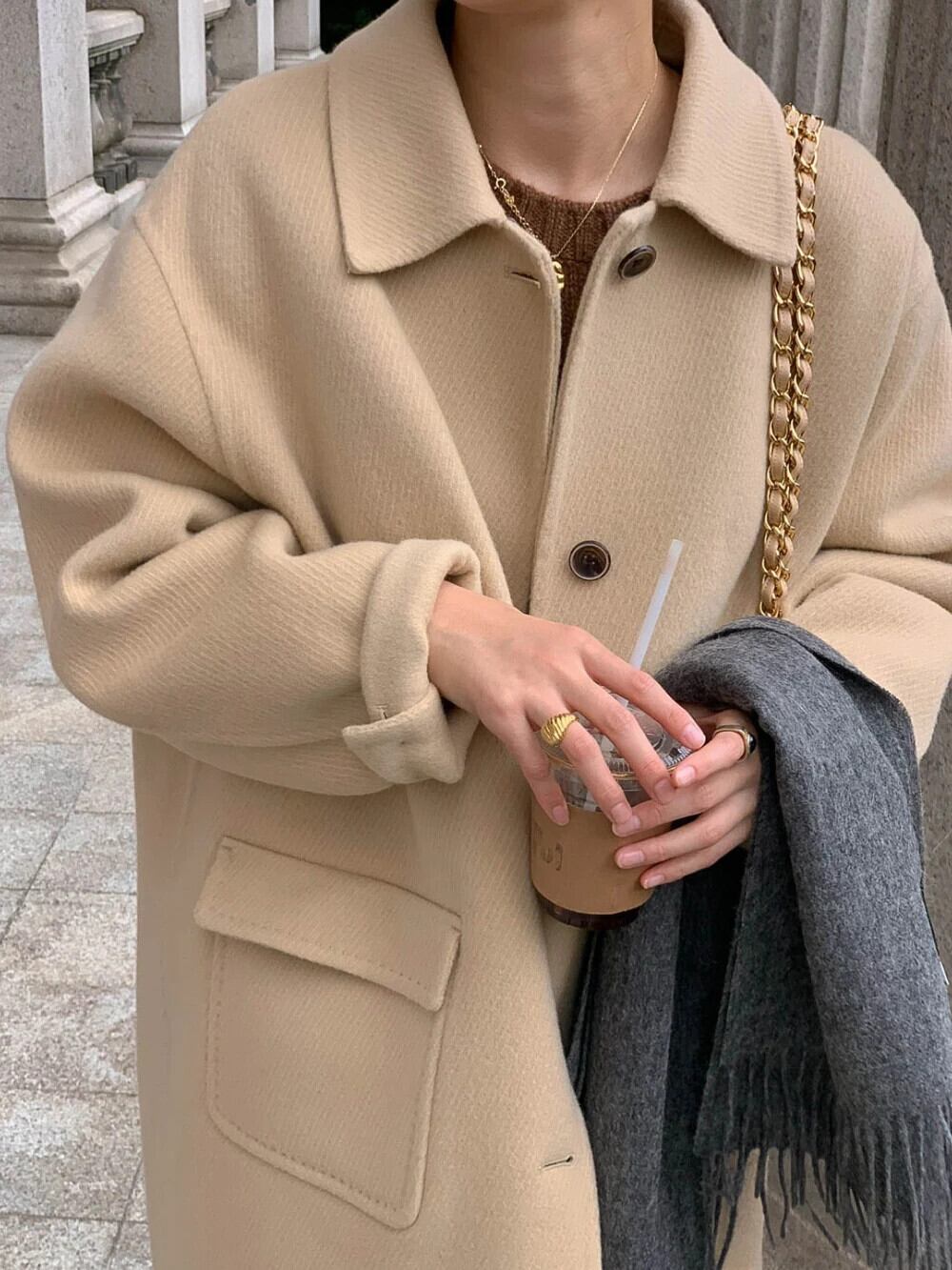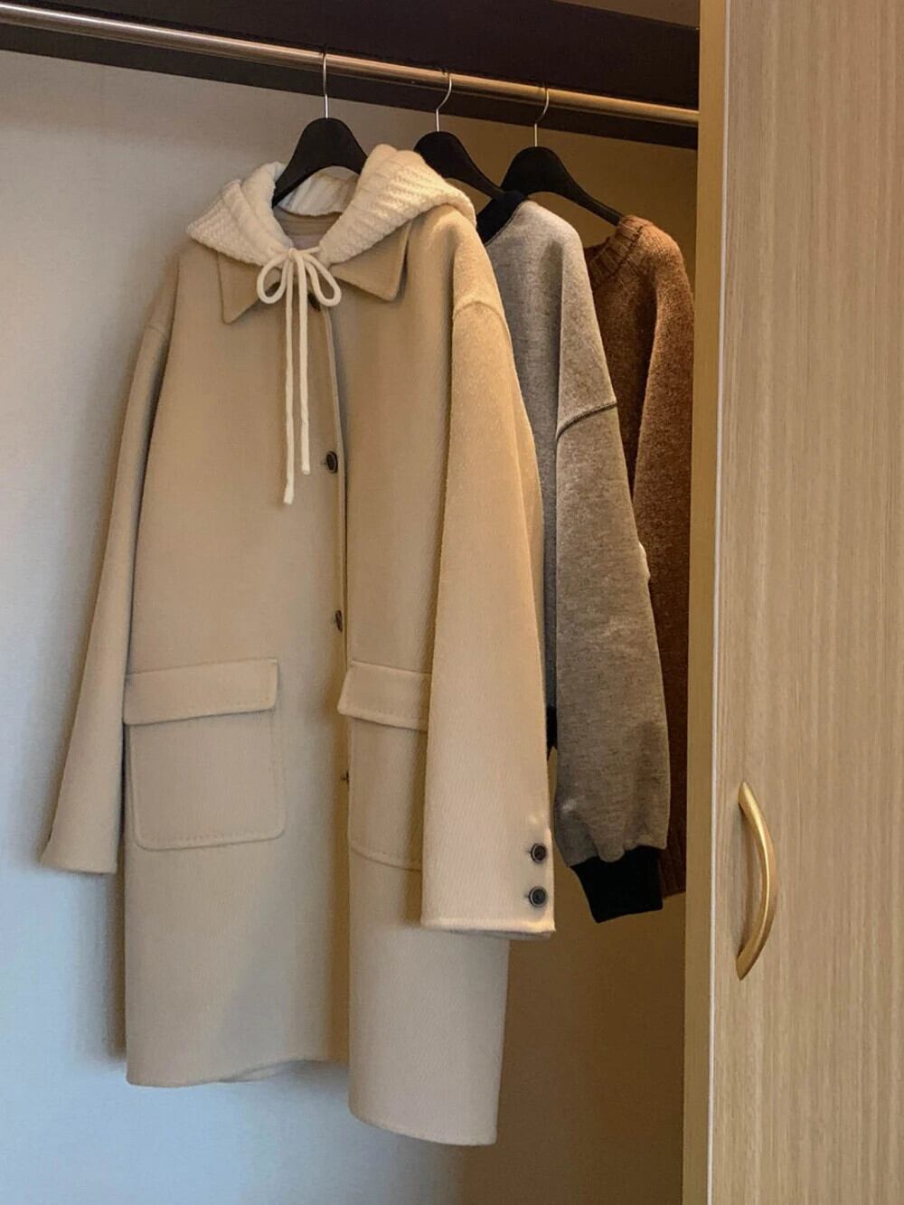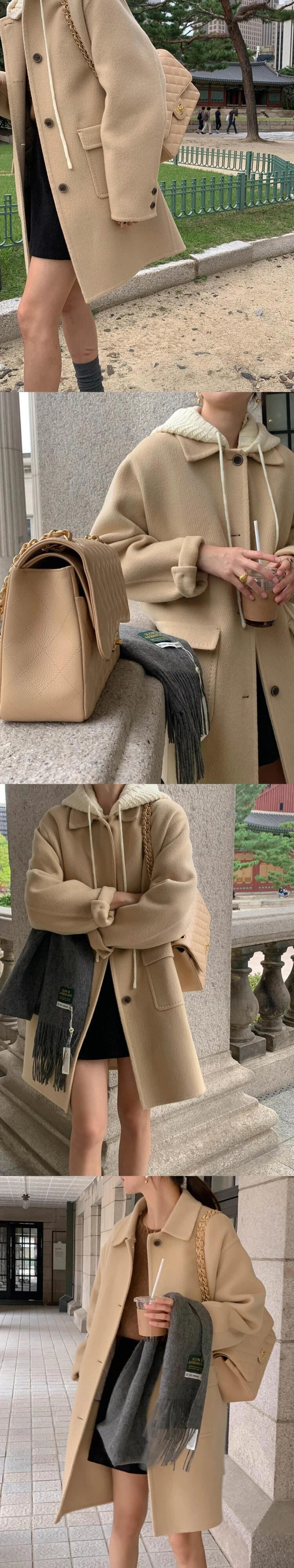 [EWQ] シックコントラストカラーフード付き巾着シングルブレストウールコートルーズ長袖ウールブレンドジャケット ロング