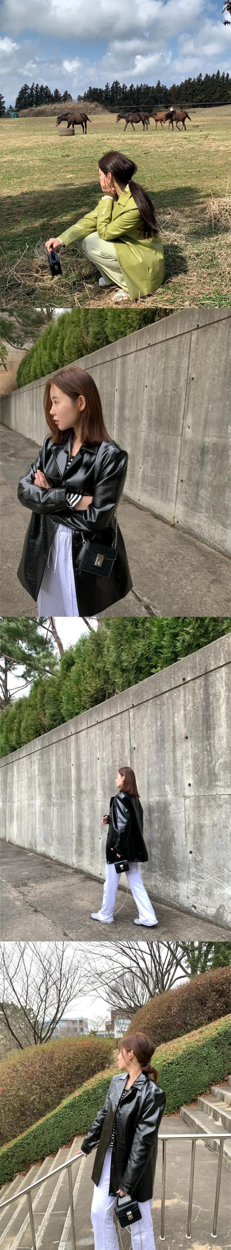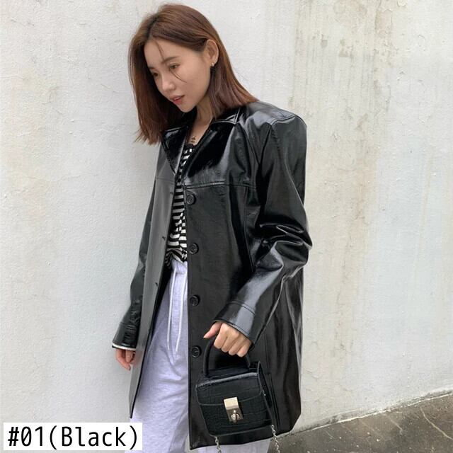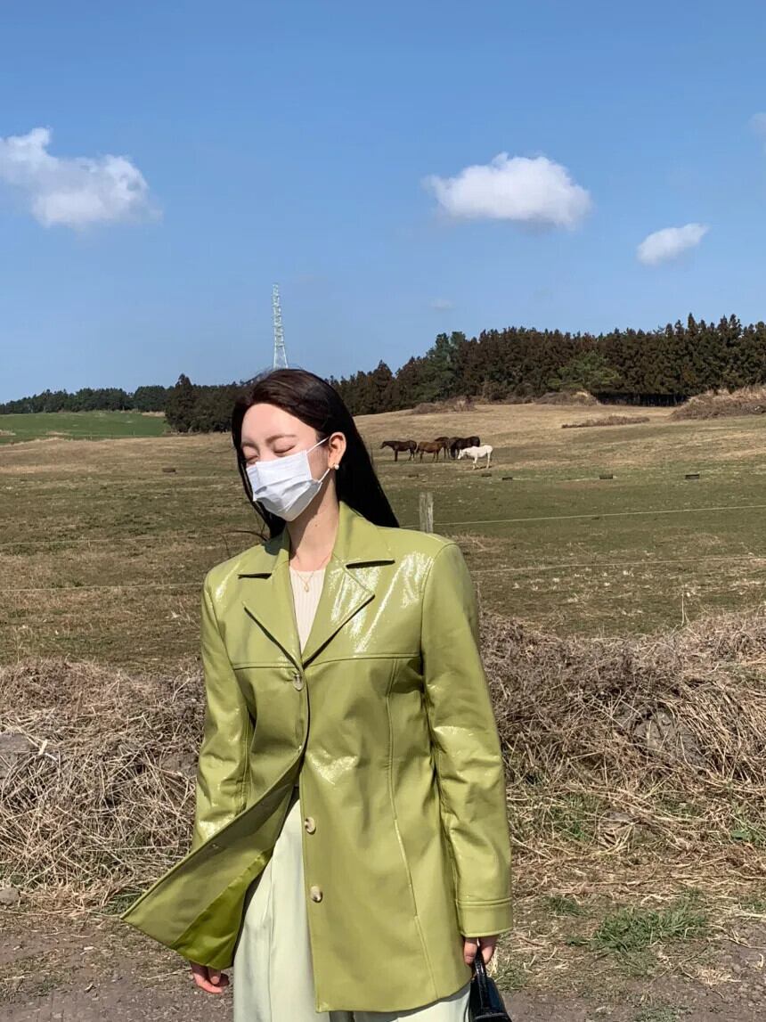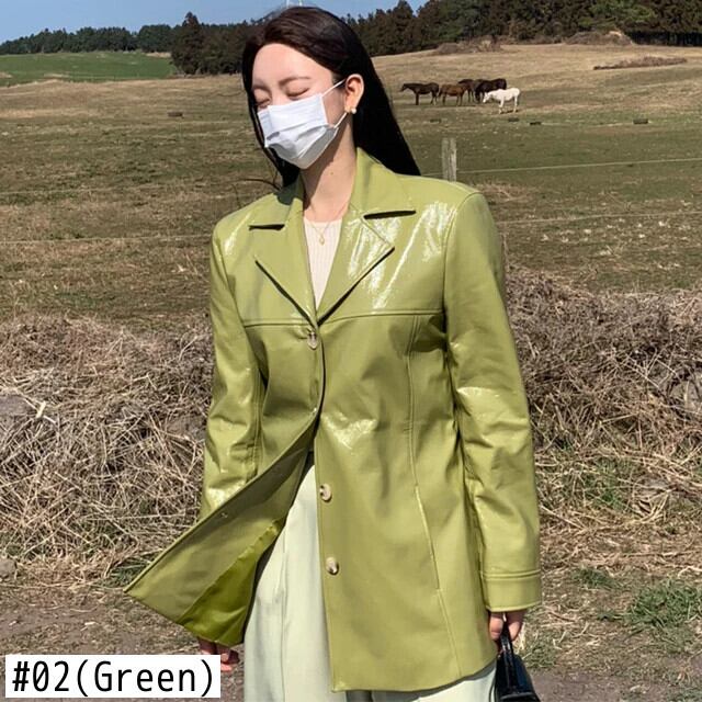 [EWQ] グリーン PU レザー ブレザー コート レディース 長袖 シングルブレスト スーツ ジャケット 秋冬 16U5307 ロング オータム 秋物 ウィンター 冬物