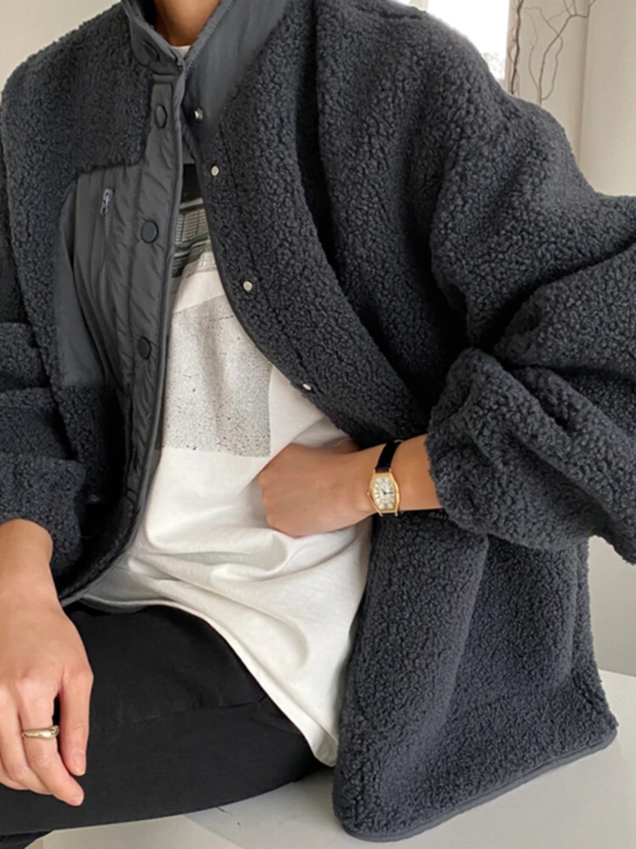 [EWQ] スタンドネック ジッパー パッチワーク シングルブレスト 厚手 暖かい ぬいぐるみ ラムウール コート ゆったり 長袖 ジャケット ロング
