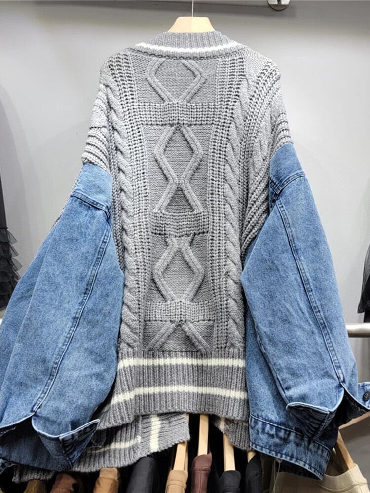 [EWQ] スタイルデニムパッチワーク長袖カーディガンニットセーターアウターパーソナライズされたルーズフィットトップ秋 ロング オータム 秋物