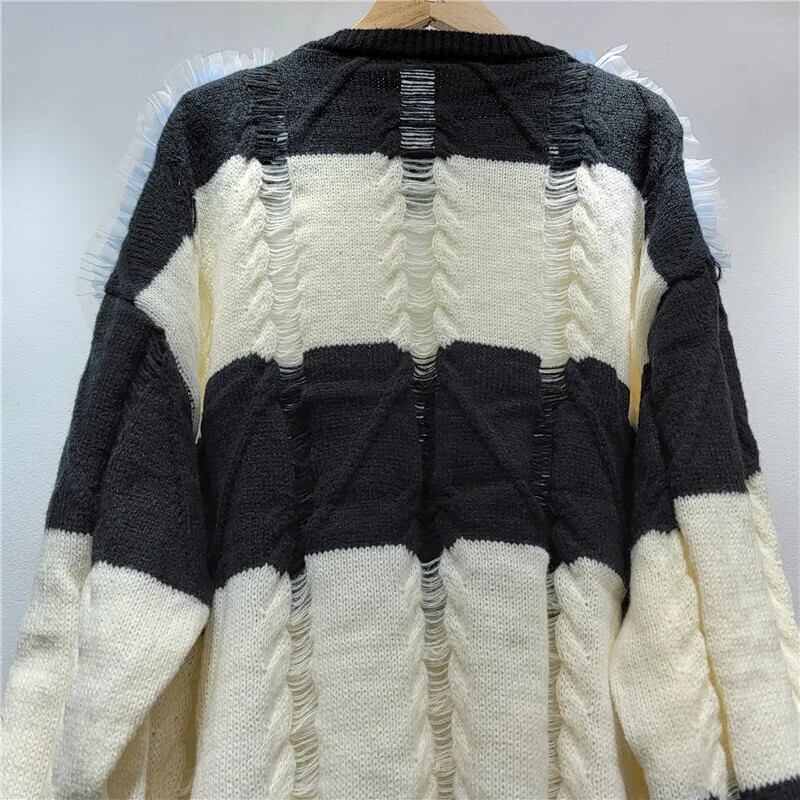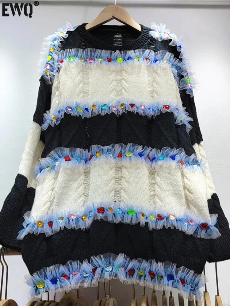 [EWQ] デザイナー ダイヤモンド パッチワーク メッシュ コントラスト カラー プルオーバー セーター カジュアル ルーズ ツイスト パターン ニット トップス 秋冬 オータム 秋物 ウィンター 冬物