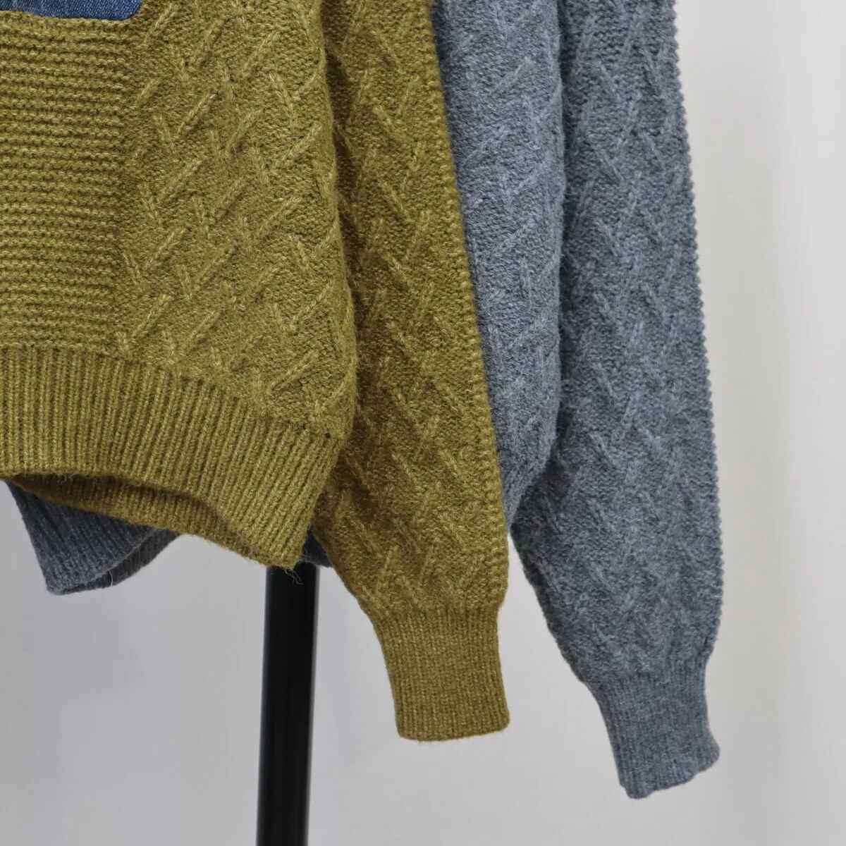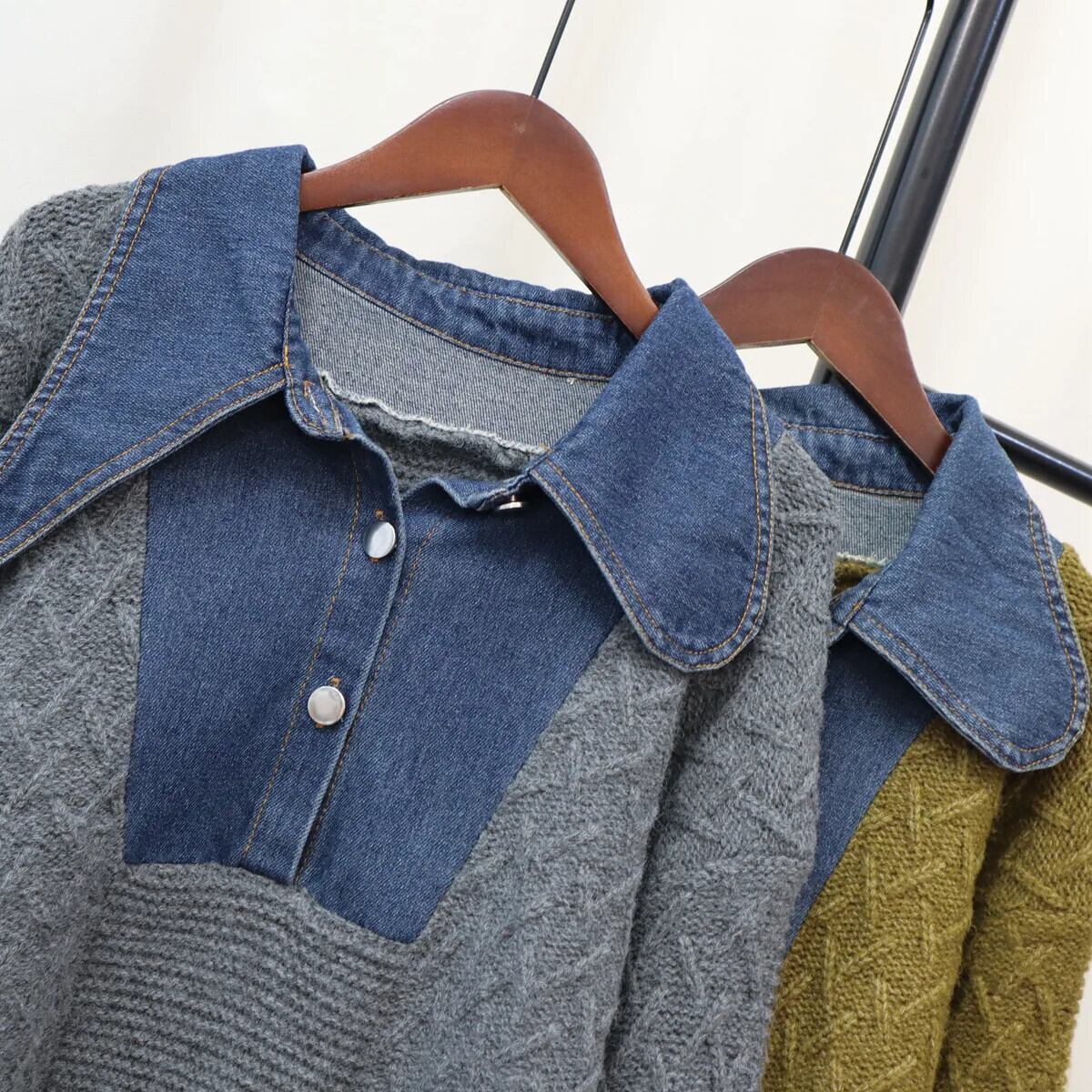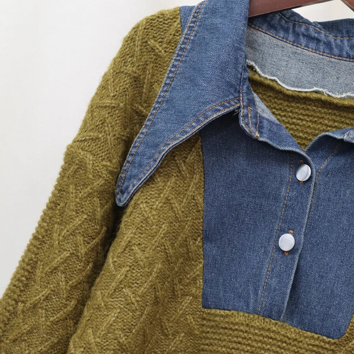 [EWQ] ストリート コントラストカラー ツイスト柄 デニム ラペル ルーズ プルオーバー セーター 長袖 ニット トップス 秋冬 ロング オータム 秋物 ウィンター 冬物