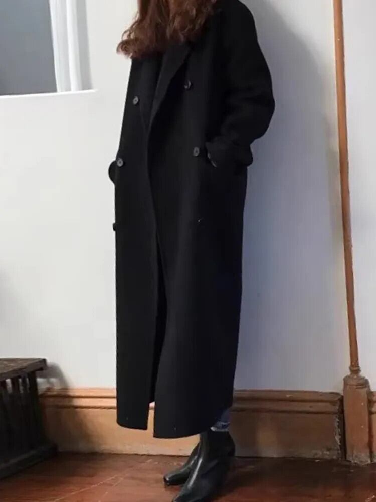[EWQ] ソリッド シンプル ノッチ ダブルブレスト ミドル ロング ウール コート ルーズ ウール ブレンド ジャケット 秋 16U5552 オータム 秋物 ソリッドカラー