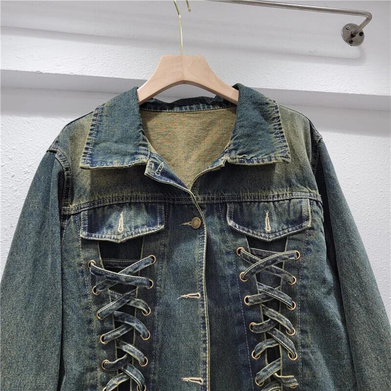 [EWQ] 巾着長袖デニムショートジャケットストリートシングルブレストルーズコート秋冬 16U4112 ロング オータム 秋物 ウィンター 冬物