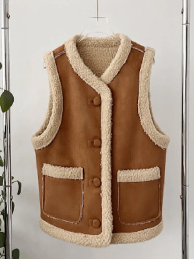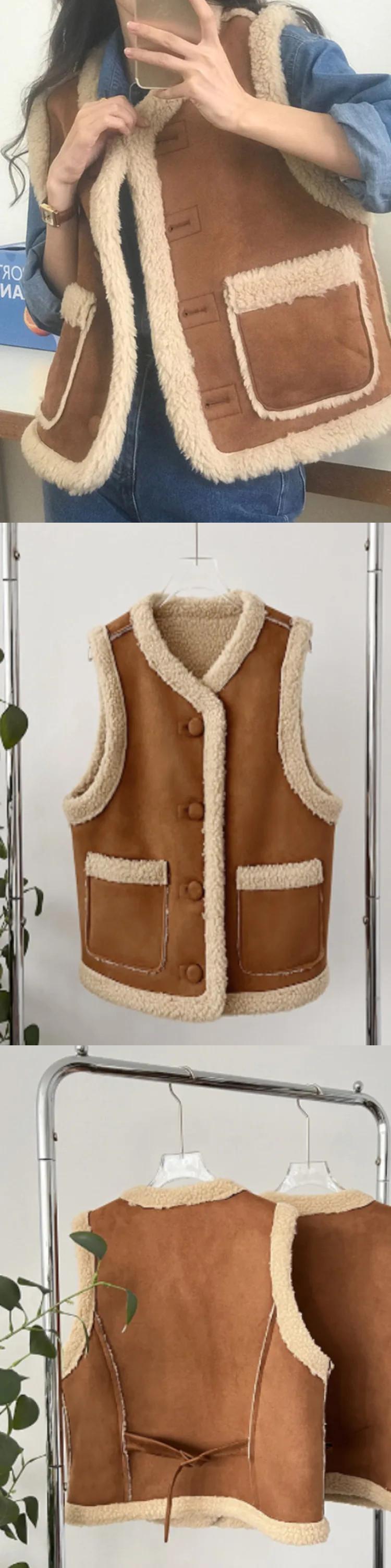 [EWQ] バージョンウールパッチワーク鹿革ベストシングルブレスト厚い秋冬ノースリーブチョッキ 6U4766 オータム 秋物 ウィンター 冬物