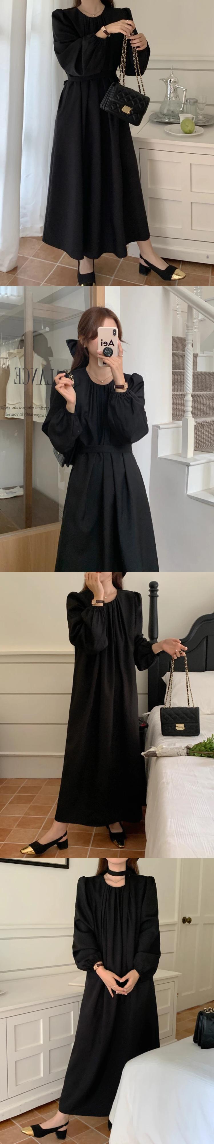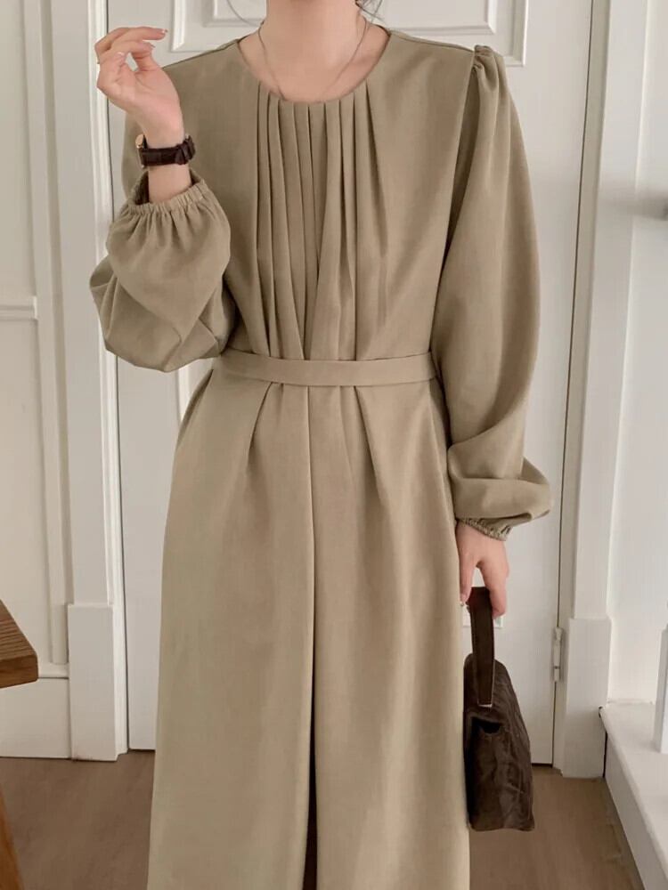 [EWQ] O ネックプリーツドレスレースアップ長袖ルーズドレス秋冬 Vestido 16U4804 ロング オータム 秋物 ウィンター 冬物 Oネック