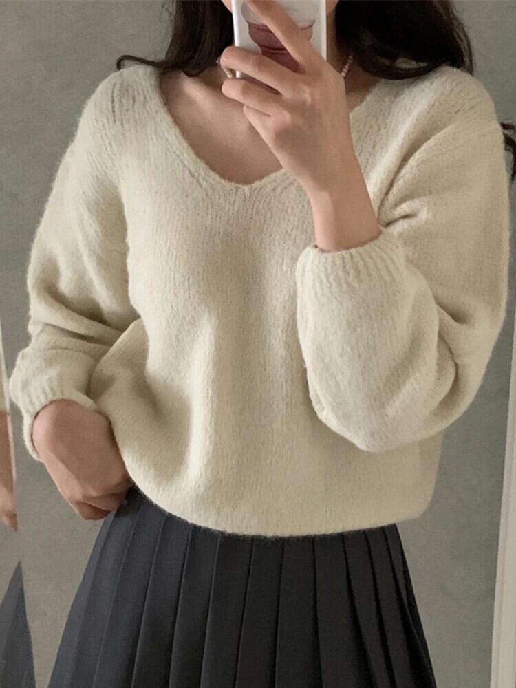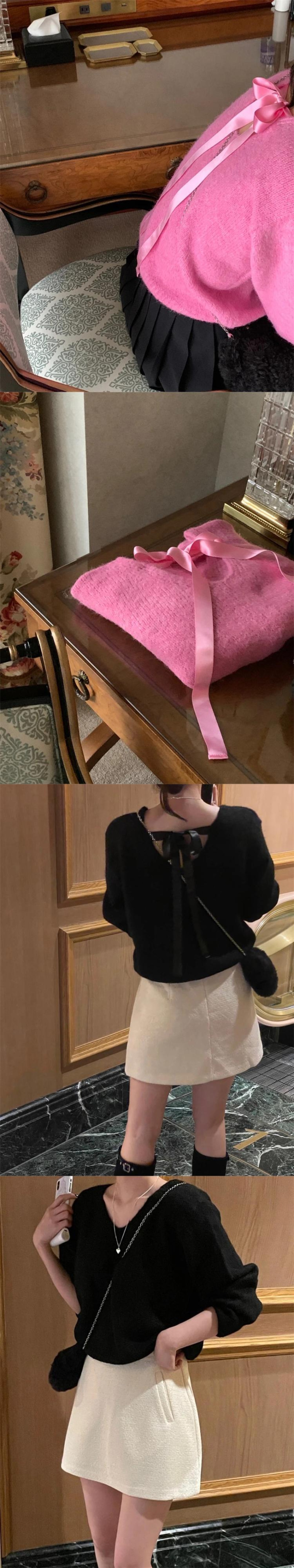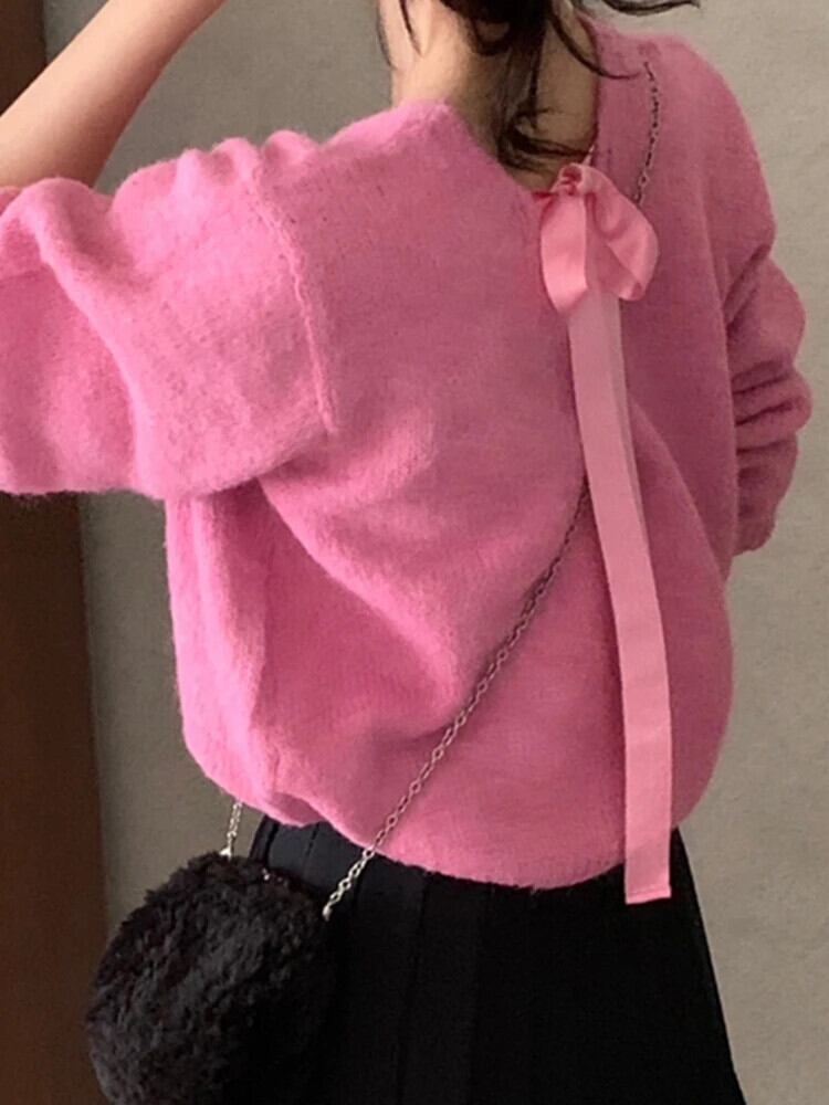 [EWQ]シックバック包帯ボウプルオーバーセーターゆったり長袖ニットトップス秋冬 ロング リボン オータム 秋物 ウィンター 冬物