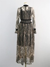 [EWQ] ロングフレアスリーブ O ネックウエストパーティーナイトセクシーマキシ Vestidos アウトステッチソフトレースドレス U588 Oネック