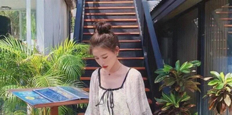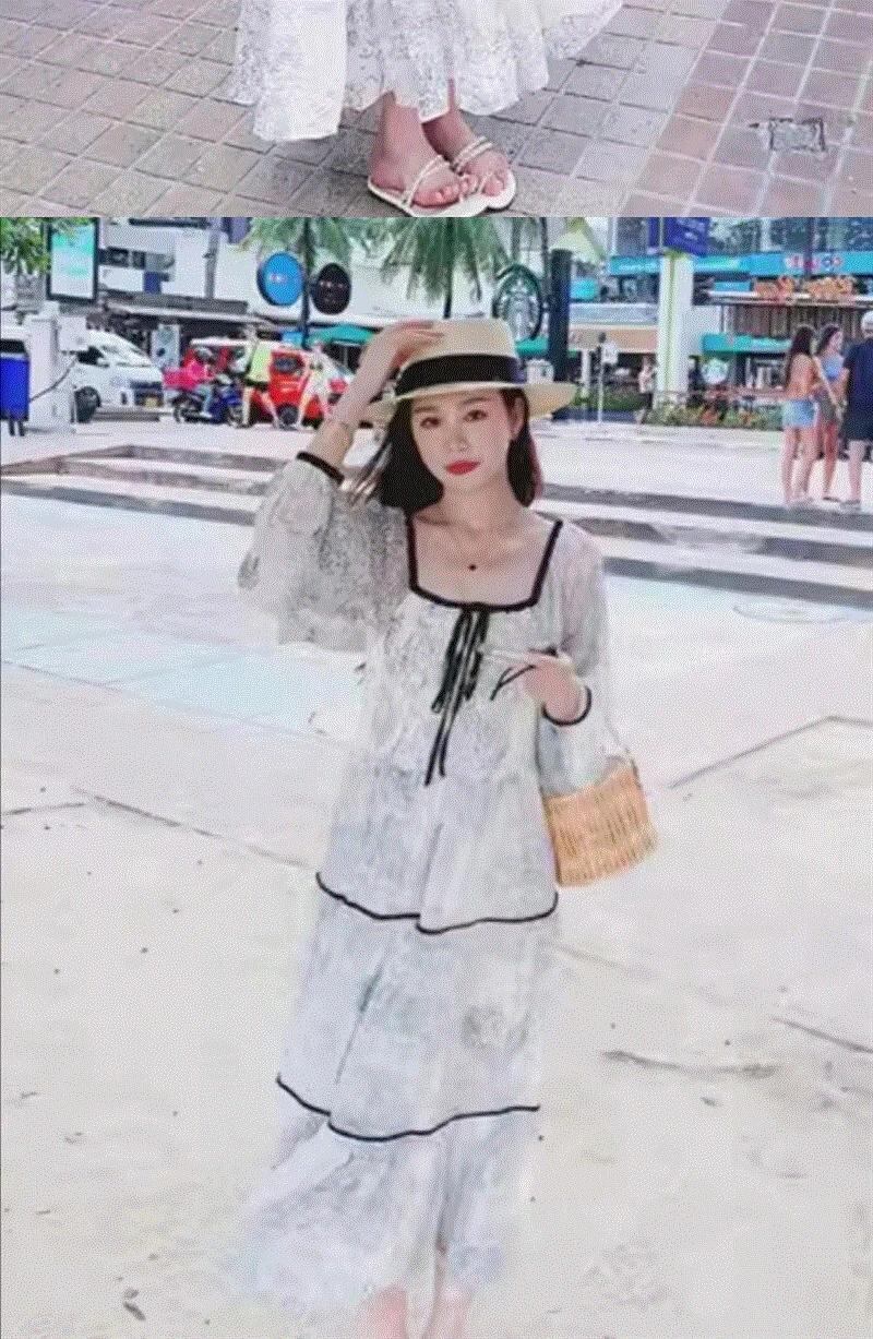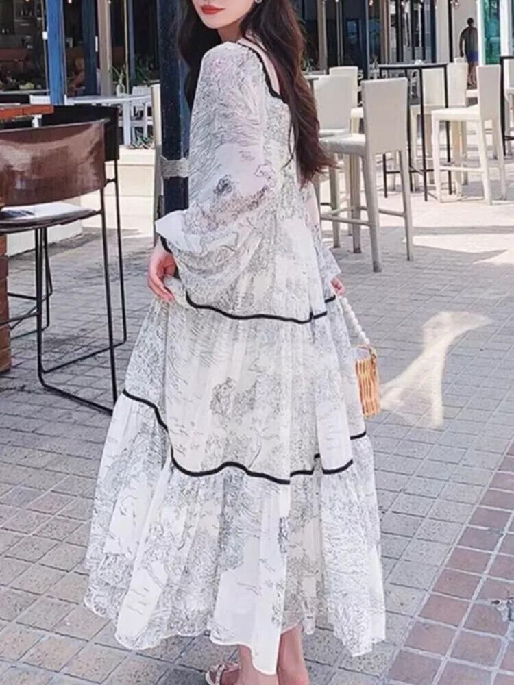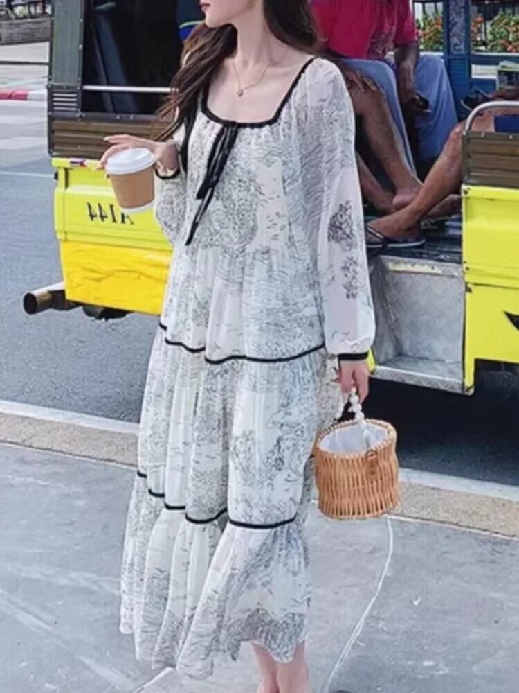 [EWQ] ホリデースタイルコントラストカラープリント巾着スクエアカラー長袖ドレスルーズ長袖Vestidos ロング スクウェア