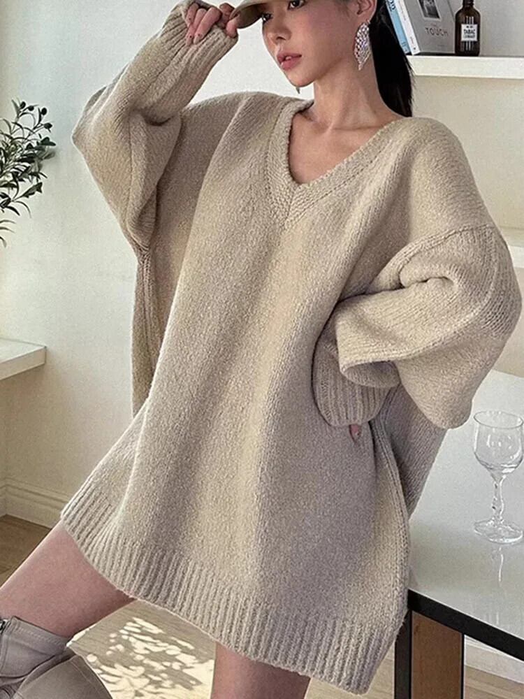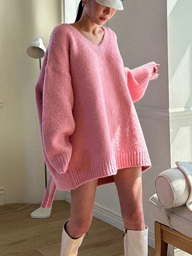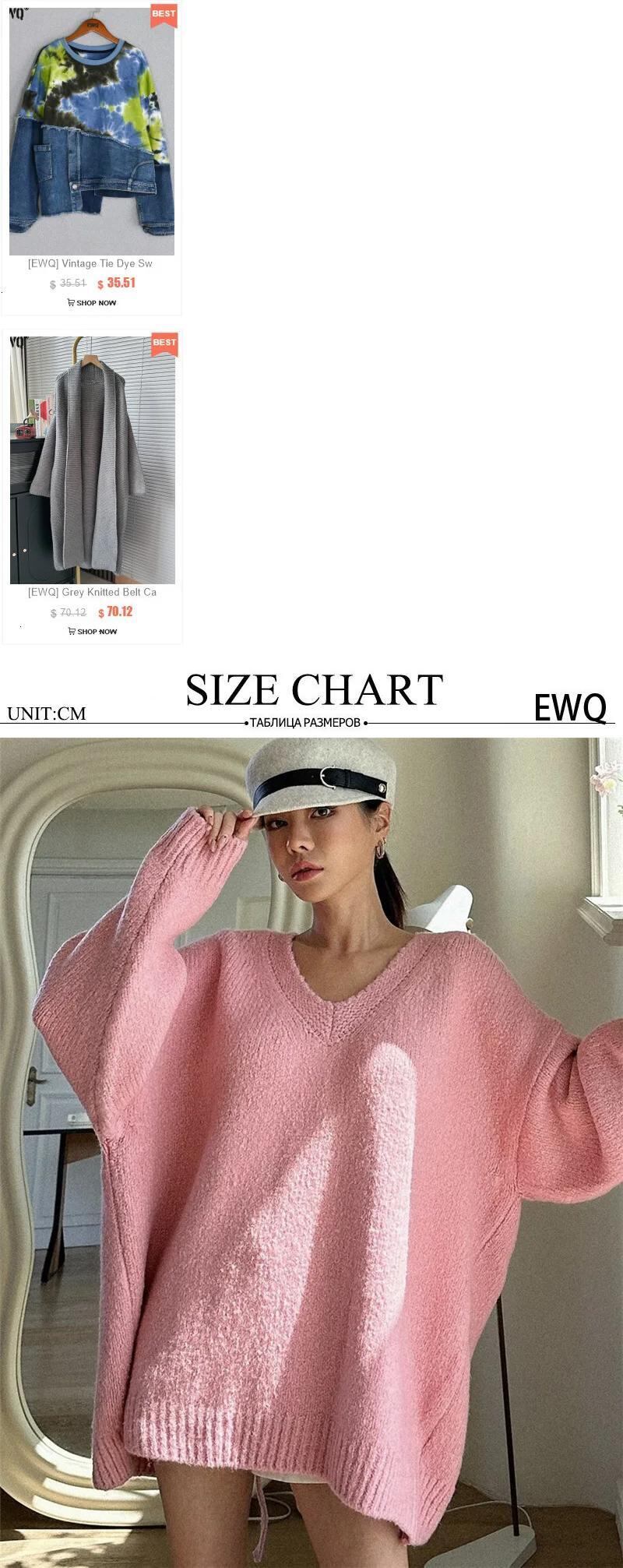 [EWQ] V ネック長袖ピンク ブルー カーキ ホワイト レースアップ美しい V ネック ニット プルオーバー セーター秋冬 6U5915 ロング オータム 秋物 ウィンター 冬物 Vネック
