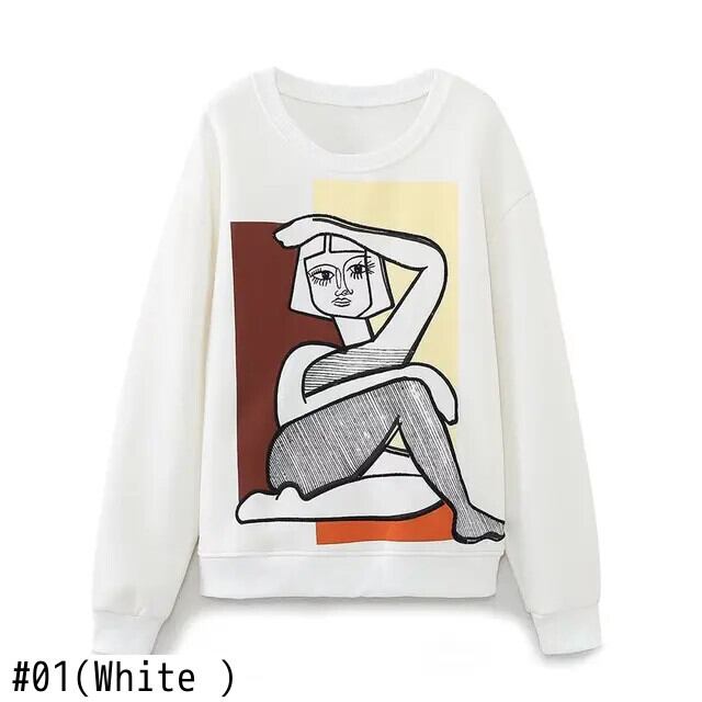 [EWQ] ホワイト長袖 O ネック少女絵漫画刺繍プリントレディーストレーナーパーカー秋春 16U6020 ロング レッド スプリング 春物 オータム 秋物 Oネック