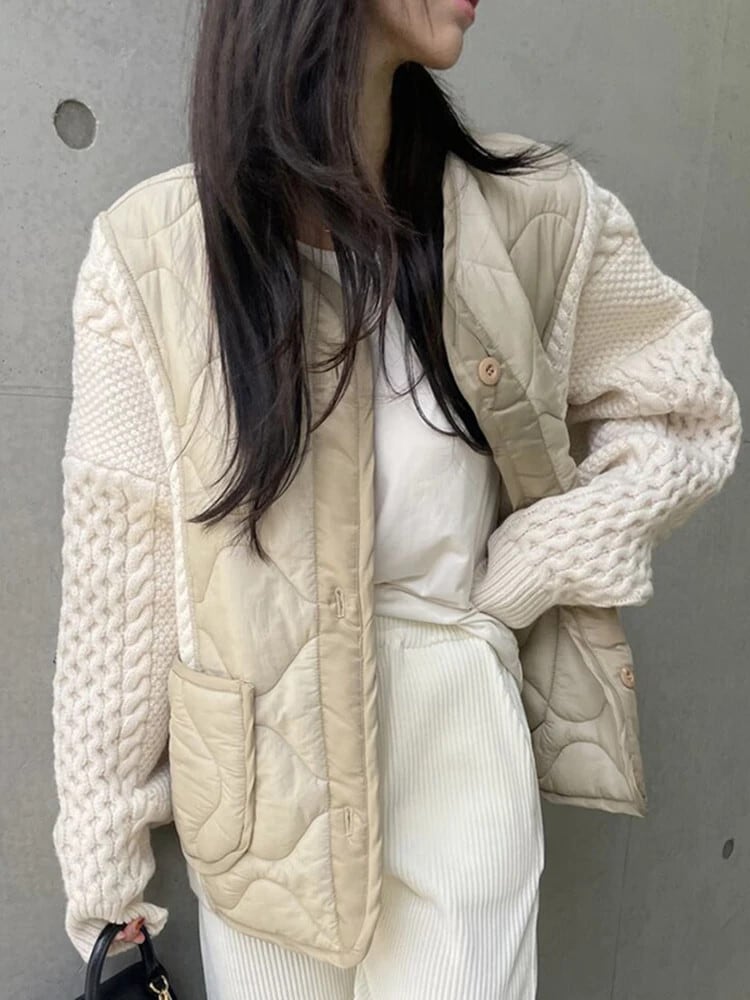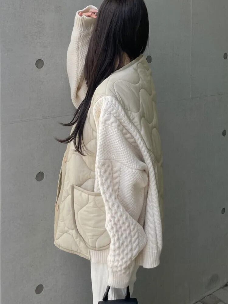 [EWQ] V ネック ニット キルティング シングルブレスト コート コントラスト長袖スプライス ステッチ コットン ジャケット 秋冬 6U6257 ロング オータム 秋物 ウィンター 冬物 Vネック