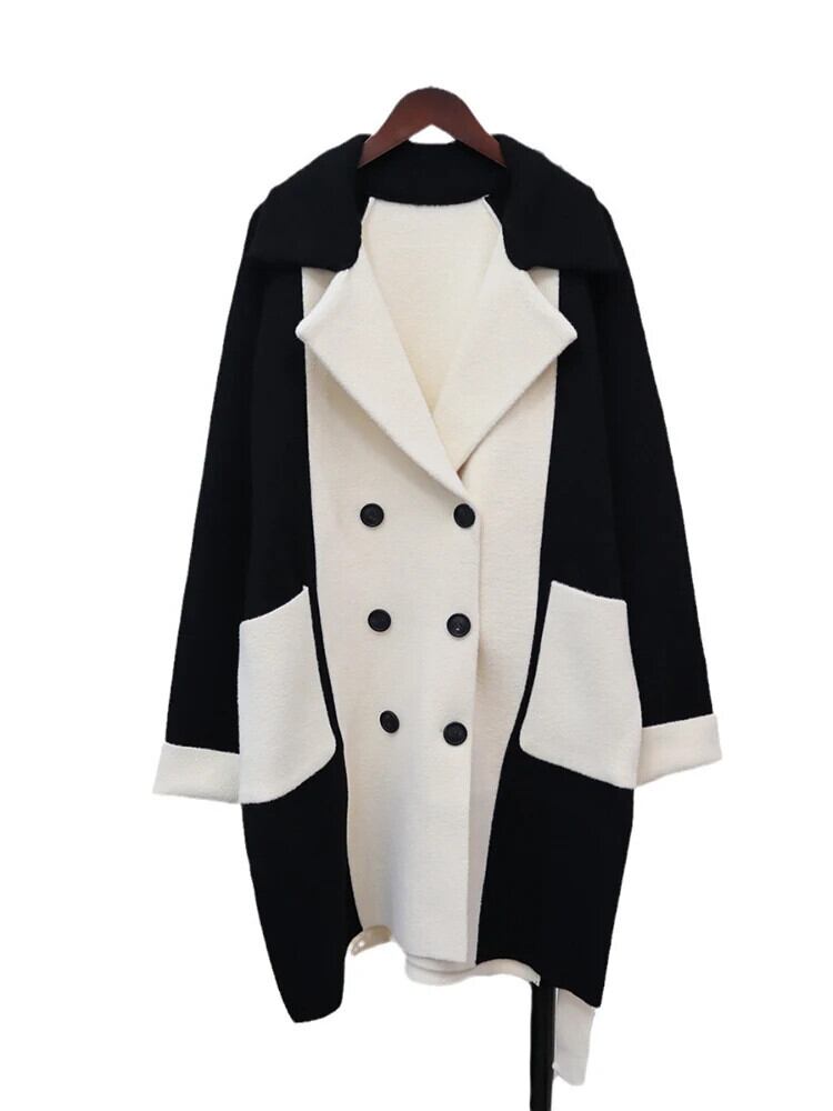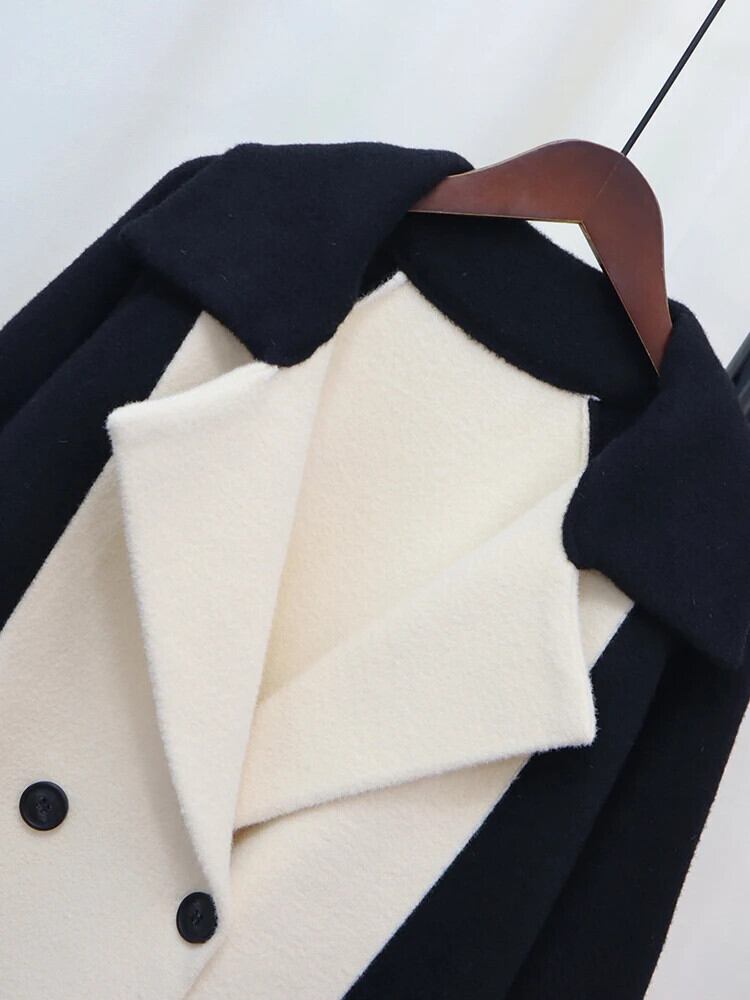 [EWQ] -end 高級コントラストカラー ブラック ホワイト パッチワーク ノッチ ダブルブレスト ウール コート ウール ブレンド ジャケット 秋 オータム 秋物