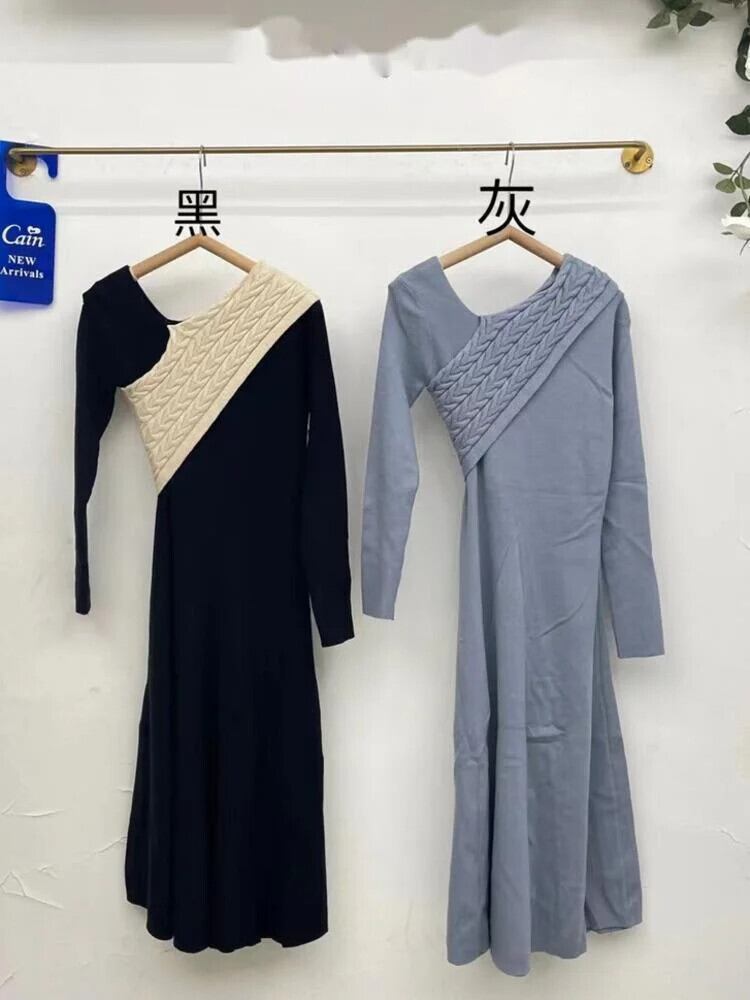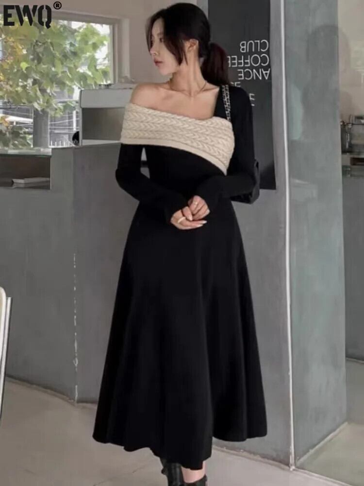 [EWQ] 長袖 V ネックコントラストカラーニットスリムドレス冬秋不規則ニットステッチパーティードレス Y553 ロング オータム 秋物 ウィンター 冬物 Vネック