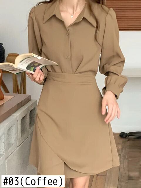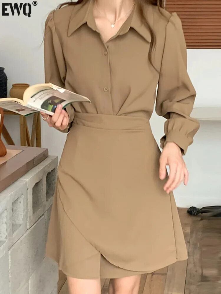 [EWQ] ドレス美しいラペルウエストスリム長袖ショートシャツブラックカーキコーヒー秋春 16U6238 ロング スプリング 春物 オータム 秋物