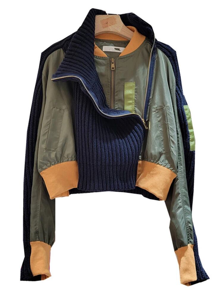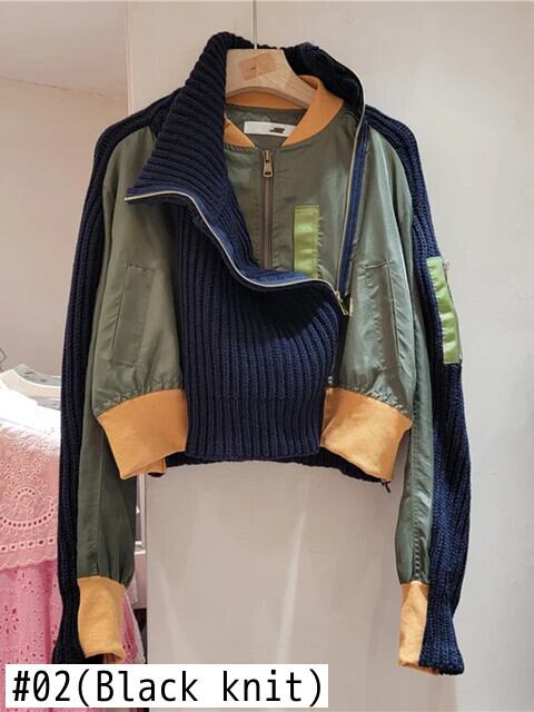 [EWQ] 長袖ニット スプライシング ジッパー レディース ジャケット アーミー グリーン トップ トレンド ボンバー コート 秋 アウター 16U5695 ロング オータム 秋物